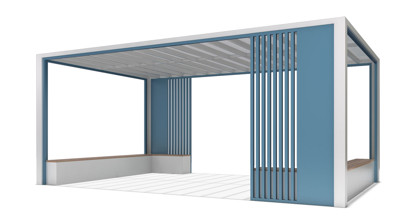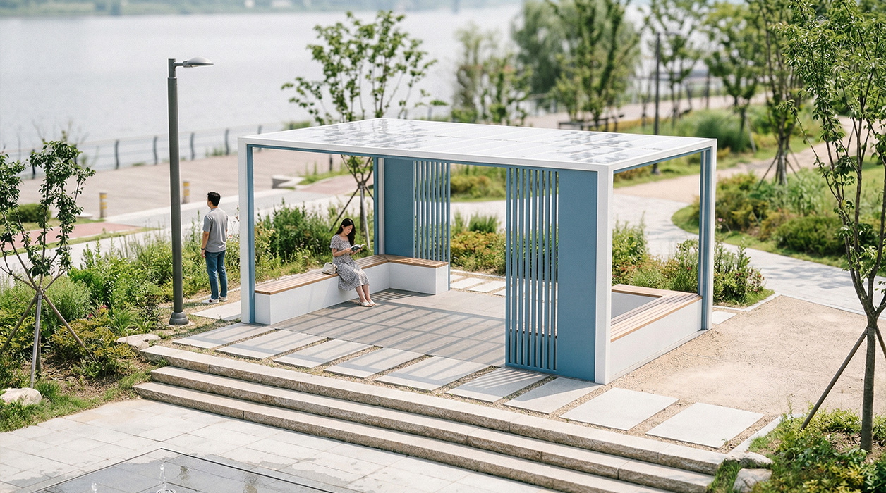 모던 블루 루버 홀 프라임 (MODERN BLUE LOUVER HALL PRIME)|DAUM-P-1705 제품목록으로 바로가기 자료 및 바로가기 나라장터 바로연결 도면 다운로드 시공사진 보러가기 기타 청량감이 느껴지는 블루 컬러의 포인트 벽체와 화이트 프레임이 어우러져 현대적이고 감각적인 경관을 연출합니다. 개방감 있는 루프 설계와 내부에 배치된 안락한 월 벤치를 통해 단지 내 메인 광장이나 산책로에서 쾌적하고 세련된 휴식 환경을 제공하는 커뮤니티 거점입니다. 제품명 모던 블루 루버 홀 프라임 (MODERN BLUE LOUVER HALL PRIME)|DAUM-P-1705 물품식별번호 25022695 규격 6,000 X 3,800 X 2,600(H) 재질 stl, galvanized, hard wood, polycarbonate 모던 블루 루버 홀 프라임 (MODERN BLUE LOUVER HALL PRIME)|DAUM-P-1705 물품식별번호 25022695 규격 6,000 X 3,800 X 2,600(H) 재질 stl, galvanized, hard wood, polycarbonate 기타 청량감이 느껴지는 블루 컬러의 포인트 벽체와 화이트 프레임이 어우러져 현대적이고 감각적인 경관을 연출합니다. 개방감 있는 루프 설계와 내부에 배치된 안락한 월 벤치를 통해 단지 내 메인 광장이나 산책로에서 쾌적하고 세련된 휴식 환경을 제공하는 커뮤니티 거점입니다. 자료 및 바로가기 나라장터 바로연결 도면 다운로드 시공사진 보러가기