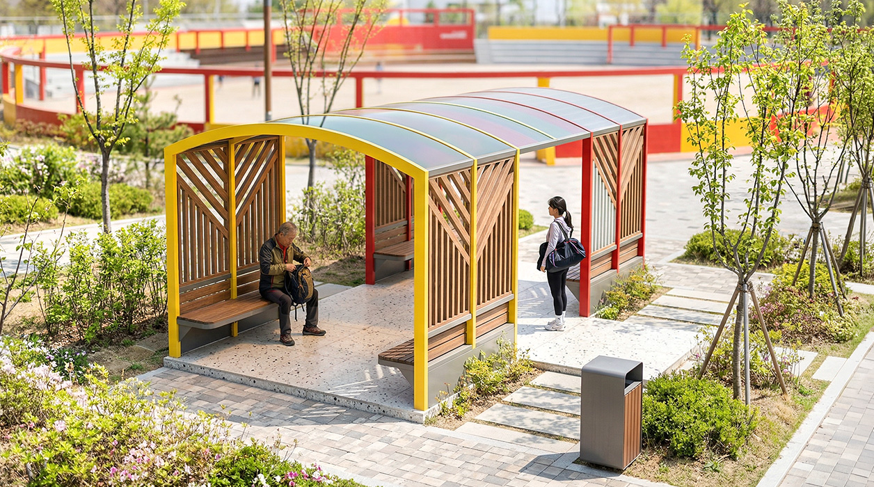 비비드 브이 벤치 홀 프라임 (VIVID V-BENCH HALL PRIME)|DAUM-P-1751 제품목록으로 바로가기 자료 및 바로가기 나라장터 바로연결 도면 다운로드 시공사진 보러가기 기타 옐로우와 레드의 강렬한 컬러 대비와 V자형 기하학 루버 패턴이 어우러져 활기찬 경관 포인트가 되어줍니다. 아치형 루프 아래 독립적인 벤치 공간을 배치하여, 단지 내에서 시각적 즐거움과 아늑한 휴식을 동시에 제공하는 감각적인 커뮤니티 거점입니다. 제품명 비비드 브이 벤치 홀 프라임 (VIVID V-BENCH HALL PRIME)|DAUM-P-1751 물품식별번호 25024046 규격 5,000 X 3,000 X 2,500(H) 재질 stl, galvanized, hard wood, polycarbonate 비비드 브이 벤치 홀 프라임 (VIVID V-BENCH HALL PRIME)|DAUM-P-1751 물품식별번호 25024046 규격 5,000 X 3,000 X 2,500(H) 재질 stl, galvanized, hard wood, polycarbonate 기타 옐로우와 레드의 강렬한 컬러 대비와 V자형 기하학 루버 패턴이 어우러져 활기찬 경관 포인트가 되어줍니다. 아치형 루프 아래 독립적인 벤치 공간을 배치하여, 단지 내에서 시각적 즐거움과 아늑한 휴식을 동시에 제공하는 감각적인 커뮤니티 거점입니다. 자료 및 바로가기 나라장터 바로연결 도면 다운로드 시공사진 보러가기