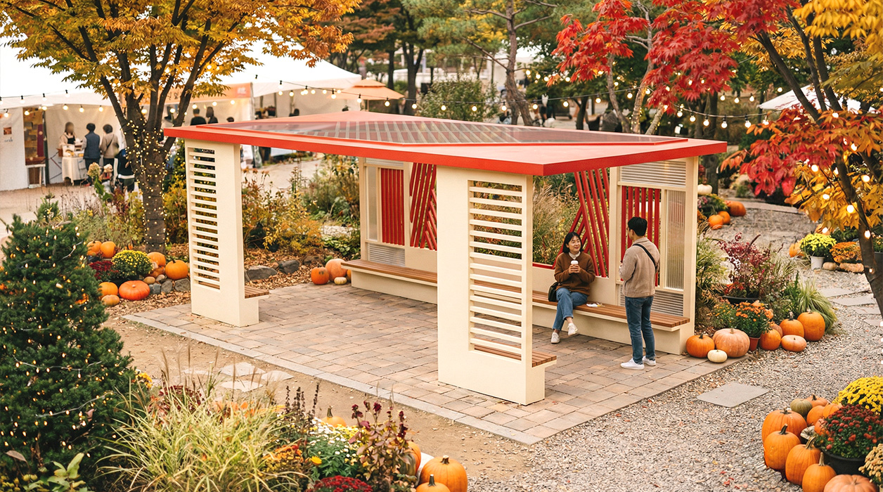 레드 루프 루버 홀 프라임 (RED ROOF LOUVER HALL PRIME)|DAUM-P-1700 제품목록으로 바로가기 자료 및 바로가기 나라장터 바로연결 도면 다운로드 시공사진 보러가기 기타 강렬한 레드 컬러 루프와 아이보리 프레임의 대비가 단지 내 역동적인 경관을 형성합니다. 포스트의 가로 루버와 배면의 감각적인 루버 스크린이 세련된 미감을 더하며, 넓은 내부 공간에 통합 월 벤치를 구성하여 활기 넘치는 복합 휴게 거점을 제공합니다. 제품명 레드 루프 루버 홀 프라임 (RED ROOF LOUVER HALL PRIME)|DAUM-P-1700 물품식별번호 25022684 규격 7,000 X 3,600 X 2,600(H) 재질 stl, galvanized, hard wood, polycarbonate 레드 루프 루버 홀 프라임 (RED ROOF LOUVER HALL PRIME)|DAUM-P-1700 물품식별번호 25022684 규격 7,000 X 3,600 X 2,600(H) 재질 stl, galvanized, hard wood, polycarbonate 기타 강렬한 레드 컬러 루프와 아이보리 프레임의 대비가 단지 내 역동적인 경관을 형성합니다. 포스트의 가로 루버와 배면의 감각적인 루버 스크린이 세련된 미감을 더하며, 넓은 내부 공간에 통합 월 벤치를 구성하여 활기 넘치는 복합 휴게 거점을 제공합니다. 자료 및 바로가기 나라장터 바로연결 도면 다운로드 시공사진 보러가기