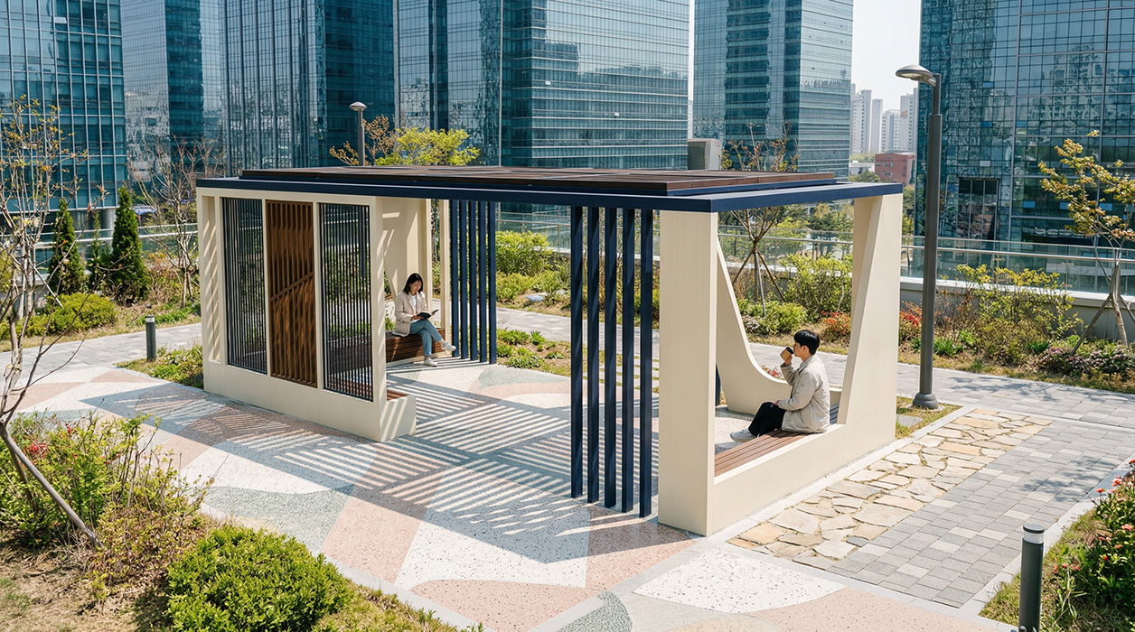 브이 월 루버 와이드 홀 프라임(V-WALL LOUVER WIDE HALL PRIME)|DAUM-P-1702 제품목록으로 바로가기 자료 및 바로가기 나라장터 바로연결 도면 다운로드 시공사진 보러가기 기타 독창적인 'V'자형 사이드 월과 딥블루 톤의 수직 루버가 어우러져 현대적이고 감각적인 조형미를 선사합니다. 와이드 프레임 내부에 통합 벤치를 조화롭게 배치하여 단지 내 주요 거점에서 다수가 편안하게 머물 수 있는 고품격 프리미엄 복합 쉼터를 제공합니다. 제품명 브이 월 루버 와이드 홀 프라임(V-WALL LOUVER WIDE HALL PRIME)|DAUM-P-1702 물품식별번호 25022687 규격 7,500 X 3,600 X 2,700(H) 재질 stl, galvanized, hard wood, polycarbonate 브이 월 루버 와이드 홀 프라임(V-WALL LOUVER WIDE HALL PRIME)|DAUM-P-1702 물품식별번호 25022687 규격 7,500 X 3,600 X 2,700(H) 재질 stl, galvanized, hard wood, polycarbonate 기타 독창적인 'V'자형 사이드 월과 딥블루 톤의 수직 루버가 어우러져 현대적이고 감각적인 조형미를 선사합니다. 와이드 프레임 내부에 통합 벤치를 조화롭게 배치하여 단지 내 주요 거점에서 다수가 편안하게 머물 수 있는 고품격 프리미엄 복합 쉼터를 제공합니다. 자료 및 바로가기 나라장터 바로연결 도면 다운로드 시공사진 보러가기