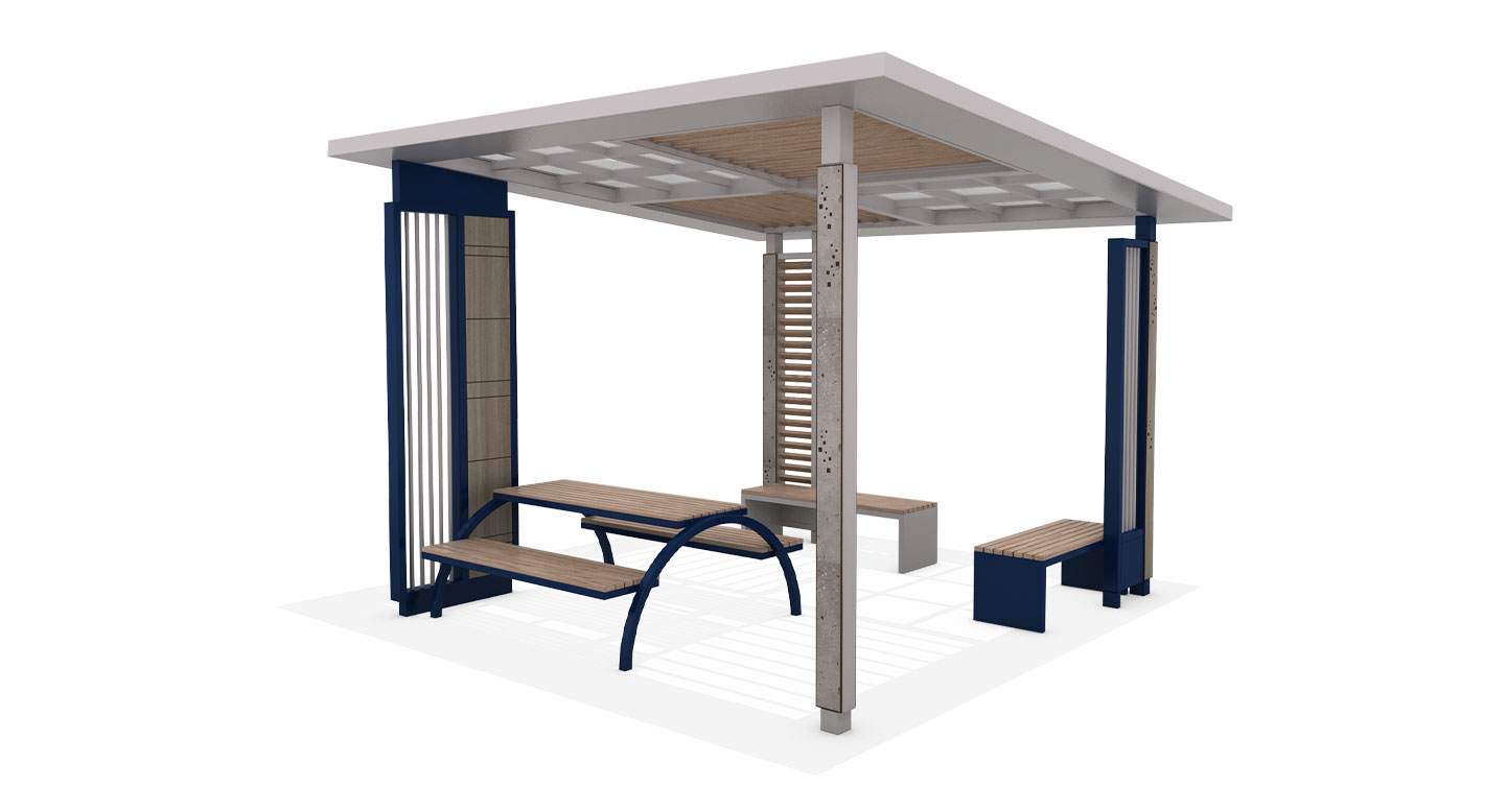 네이비엣지 플러스(NAVY-EDGE PLUS)|DAUM-P-2125 제품목록으로 바로가기 자료 및 바로가기 나라장터 바로연결 도면 다운로드 시공사진 보러가기 기타 네이비 톤의 블루 프레임 구조를 유지한 사각 소형 복합형으로, 벤치와 테이블이 더해져 휴식과 대화를 동시에 수용하며 단지 내 체류 공간의 활용도를 높입니다. 제품명 네이비엣지 플러스(NAVY-EDGE PLUS)|DAUM-P-2125 물품식별번호 25811745 규격 3,800 X 3,800 X 2,875(H) 재질 stl, hard wood, galvanized, polycarbonate 네이비엣지 플러스(NAVY-EDGE PLUS)|DAUM-P-2125 물품식별번호 25811745 규격 3,800 X 3,800 X 2,875(H) 재질 stl, hard wood, galvanized, polycarbonate 기타 네이비 톤의 블루 프레임 구조를 유지한 사각 소형 복합형으로, 벤치와 테이블이 더해져 휴식과 대화를 동시에 수용하며 단지 내 체류 공간의 활용도를 높입니다. 자료 및 바로가기 나라장터 바로연결 도면 다운로드 시공사진 보러가기