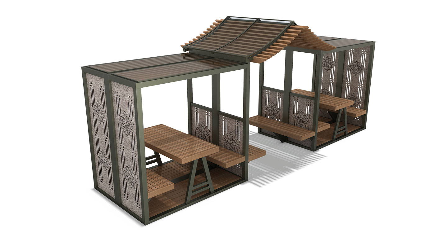 앤틱 듀오 하우스(ANTIQUE DUO HOUSE)|DAUMP-429M-1 제품목록으로 바로가기 자료 및 바로가기 나라장터 바로연결 도면 다운로드 시공사진 보러가기 기타 정교한 전통 문양 패널이 돋보이는 두 개의 박스형 유닛이 박공지붕 통로로 이어진 형태입니다. 고전적인 우아함과 현대적인 모듈러 구조가 결합된 프리미엄 조형 공간입니다. 제품명 앤틱 듀오 하우스(ANTIQUE DUO HOUSE)|DAUMP-429M-1 물품식별번호 25530470 규격 6,300 X 2,200 X 2,750(H) 재질 stl, hard wood, pc, hpl 앤틱 듀오 하우스(ANTIQUE DUO HOUSE)|DAUMP-429M-1 물품식별번호 25530470 규격 6,300 X 2,200 X 2,750(H) 재질 stl, hard wood, pc, hpl 기타 정교한 전통 문양 패널이 돋보이는 두 개의 박스형 유닛이 박공지붕 통로로 이어진 형태입니다. 고전적인 우아함과 현대적인 모듈러 구조가 결합된 프리미엄 조형 공간입니다. 자료 및 바로가기 나라장터 바로연결 도면 다운로드 시공사진 보러가기