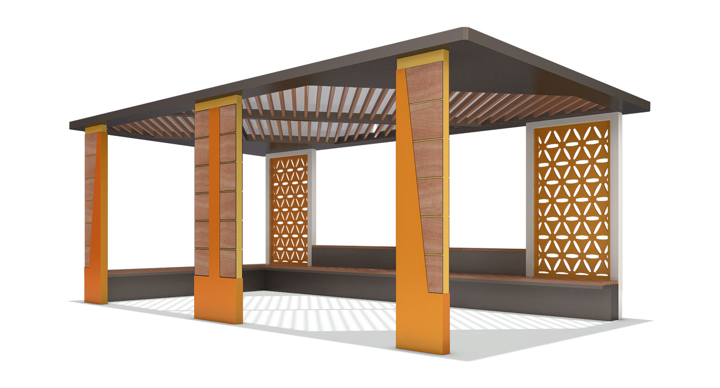사각 대형 복합형 카테고리의 웅장함을 대표하는 모델로, 강렬한 오렌지 컬러 포인트와 세련된 타공 파티션이 결합된 프리미엄 쉘터입니다. 내부를 감싸는 일체형 벤치는 다수의 사용자가 동시에 휴식할 수 있는 넉넉한 공간을 제공하며, 상부의 정교한 루버 디자인과 측면 파티션이 만들어내는 빛의 변주는 단지 내 광장이나 커뮤니티 공간의 품격을 한층 높여줍니다.