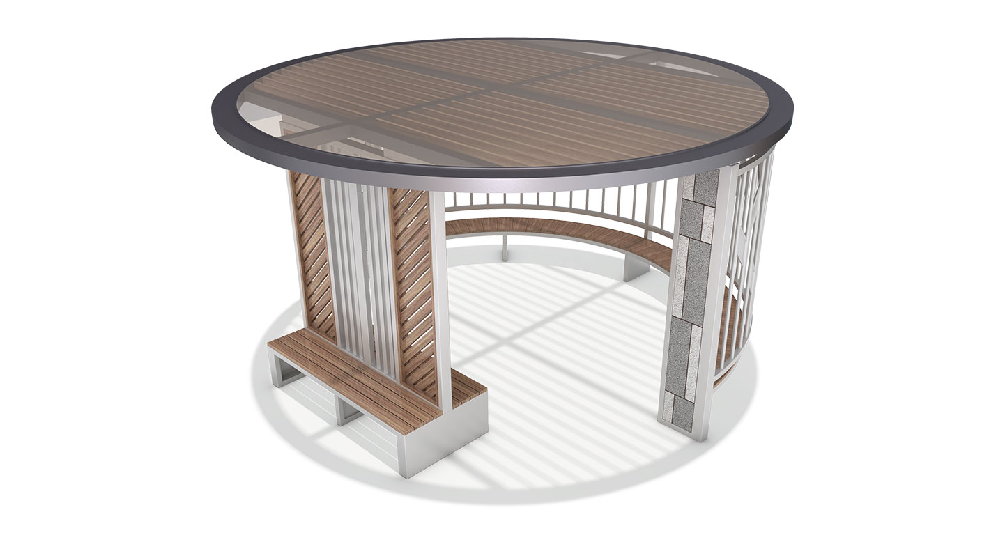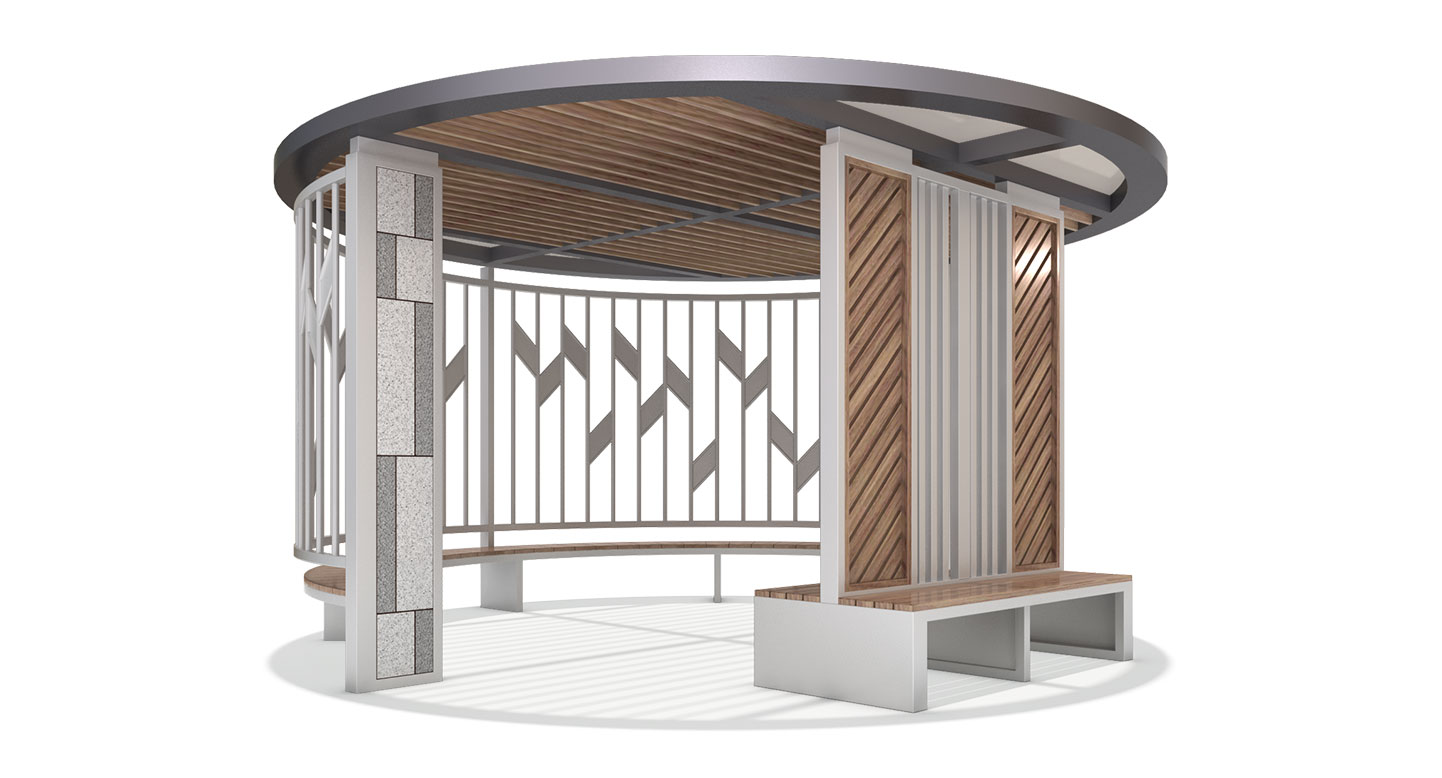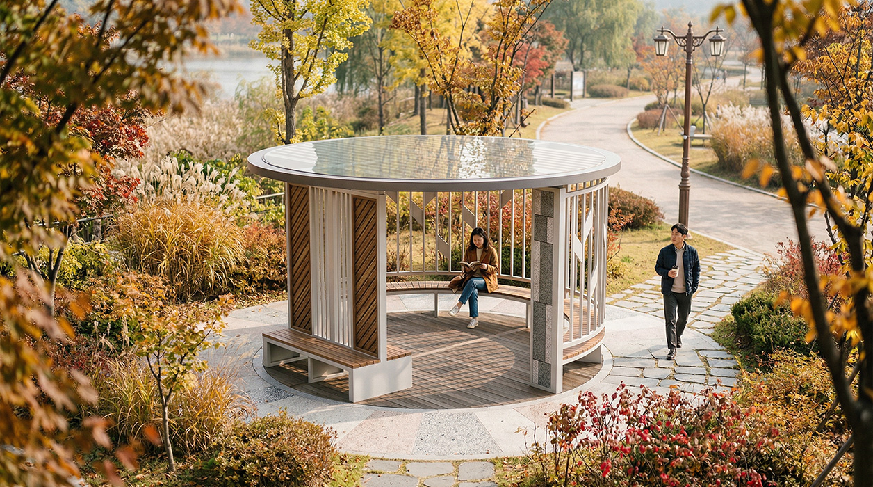 쉐브론 우드 월 라운드(CHEVRON WOOD WALL ROUND)|DAUM-P-316 제품목록으로 바로가기 자료 및 바로가기 나라장터 바로연결 도면 다운로드 시공사진 보러가기 기타 쉐브론 패턴의 우드 월과 수직 프레임이 조화를 이뤄 중후하면서도 따뜻한 미감을 선사합니다. 루프 상단의 목재 루버와 하부의 월 벤치, 독립형 벤치가 입체적으로 연결되어 단지 내 중심 광장에서 상징적인 휴게 거점 역할을 수행합니다. 제품명 쉐브론 우드 월 라운드(CHEVRON WOOD WALL ROUND)|DAUM-P-316 물품식별번호 25018210 규격 5,000 X 5,000 X 2,625(H) 재질 stl, hard wood, galvanized, polycarbonate 쉐브론 우드 월 라운드(CHEVRON WOOD WALL ROUND)|DAUM-P-316 물품식별번호 25018210 규격 5,000 X 5,000 X 2,625(H) 재질 stl, hard wood, galvanized, polycarbonate 기타 쉐브론 패턴의 우드 월과 수직 프레임이 조화를 이뤄 중후하면서도 따뜻한 미감을 선사합니다. 루프 상단의 목재 루버와 하부의 월 벤치, 독립형 벤치가 입체적으로 연결되어 단지 내 중심 광장에서 상징적인 휴게 거점 역할을 수행합니다. 자료 및 바로가기 나라장터 바로연결 도면 다운로드 시공사진 보러가기