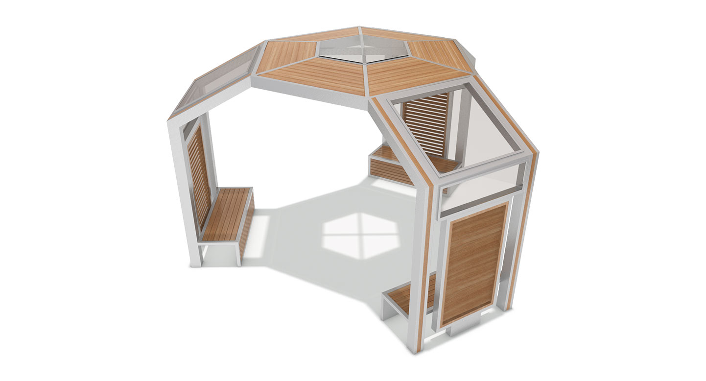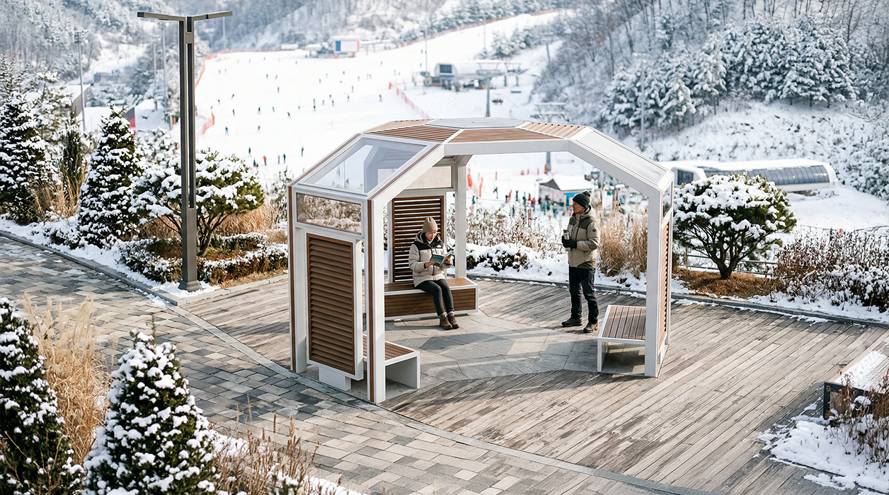 헥사곤 글라스 라운드(HEXAGON GLASS ROUND)|DAUM-P-137A 제품목록으로 바로가기 자료 및 바로가기 나라장터 바로연결 도면 다운로드 시공사진 보러가기 기타 육각형의 기하학적 골조와 글라스 루프가 결합되어 현대 건축물 같은 웅장한 미감을 선사합니다. 포스트 내부에 배치된 독립형 벤치와 루버 스크린을 통해 단지 내 메인 광장에서 프라이빗하면서도 개방감 있는 고급 휴게 거점을 형성합니다. 제품명 헥사곤 글라스 라운드(HEXAGON GLASS ROUND)|DAUM-P-137A 물품식별번호 25025060 규격 5,400 X 4,624 X 3,100(H) 재질 stl, hard wood, polycarbonate 헥사곤 글라스 라운드(HEXAGON GLASS ROUND)|DAUM-P-137A 물품식별번호 25025060 규격 5,400 X 4,624 X 3,100(H) 재질 stl, hard wood, polycarbonate 기타 육각형의 기하학적 골조와 글라스 루프가 결합되어 현대 건축물 같은 웅장한 미감을 선사합니다. 포스트 내부에 배치된 독립형 벤치와 루버 스크린을 통해 단지 내 메인 광장에서 프라이빗하면서도 개방감 있는 고급 휴게 거점을 형성합니다. 자료 및 바로가기 나라장터 바로연결 도면 다운로드 시공사진 보러가기