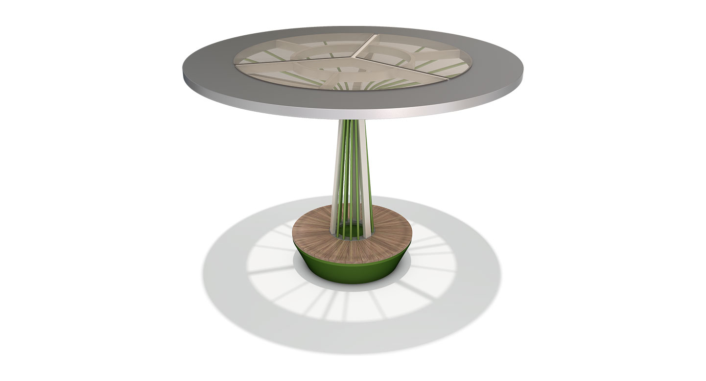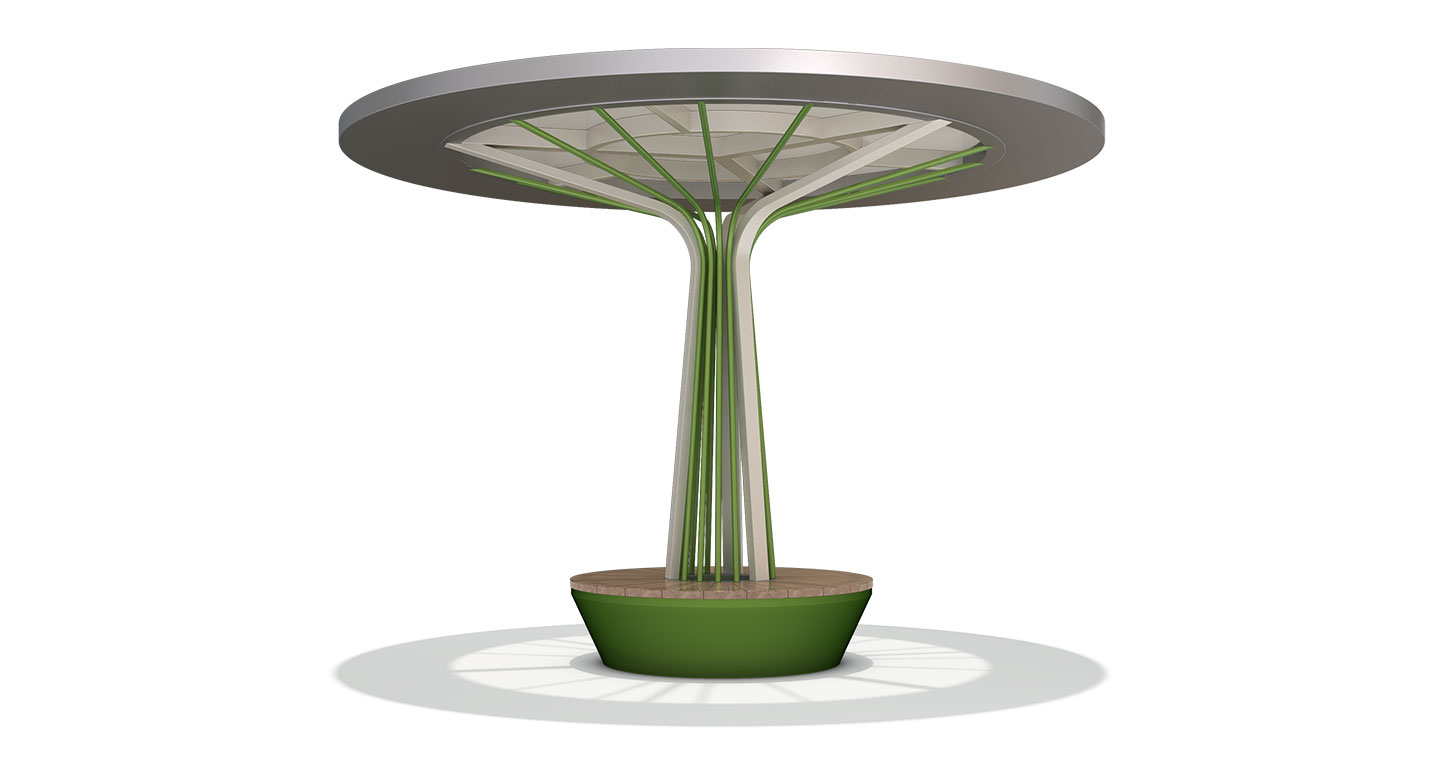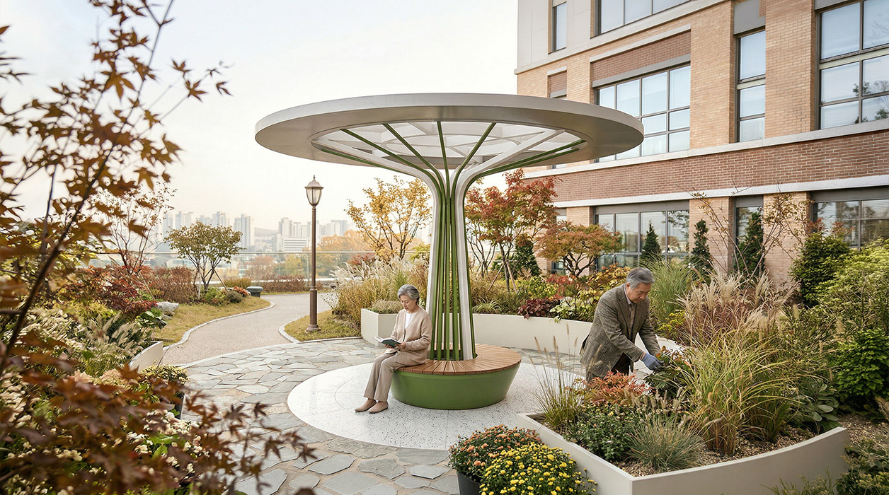 중앙의 그린 포인트 포스트에서 뻗어 나가는 방사형 루프 살대가 마치 나무 아래에 머무는 듯한 자연스러운 휴식 환경을 선사합니다. 콤팩트한 원반형 루프와 기둥을 감싸는 원형 벤치가 조화를 이뤄, 단지 내 산책로나 좁은 자투리 공간에서도 효율적인 랜드마크 쉼터 역할을 수행합니다.