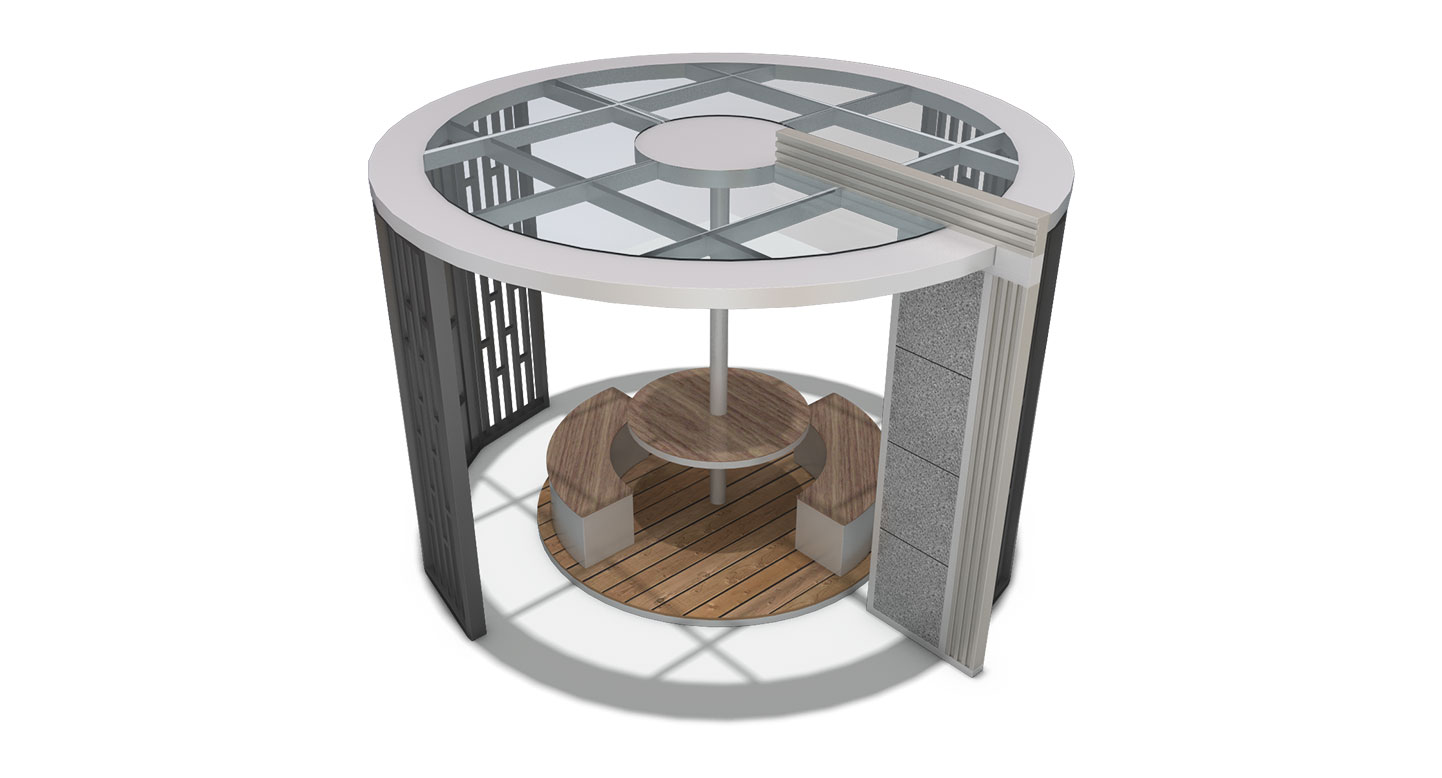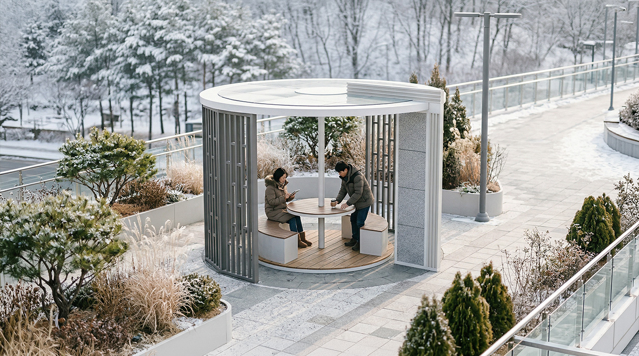 모던 링 테이블 라운드(MODERN RING TABLE ROUND)|DAUM-P-317 제품목록으로 바로가기 자료 및 바로가기 나라장터 바로연결 도면 다운로드 시공사진 보러가기 기타 원형 테이블과 벤치를 통합한 일체형 구조가 화이트 링 루프 아래 콤팩트하게 배치되었습니다. 세련된 석재 패턴 벽체와 수직 루버가 시선을 적절히 차단하여 단지 내 산책로에서 아늑한 소모임 공간을 제공합니다. 제품명 모던 링 테이블 라운드(MODERN RING TABLE ROUND)|DAUM-P-317 물품식별번호 25018211 규격 4,200 X 4,000 X 2,800(H) 재질 stl, hard wood, galvanized, polycarbonate 모던 링 테이블 라운드(MODERN RING TABLE ROUND)|DAUM-P-317 물품식별번호 25018211 규격 4,200 X 4,000 X 2,800(H) 재질 stl, hard wood, galvanized, polycarbonate 기타 원형 테이블과 벤치를 통합한 일체형 구조가 화이트 링 루프 아래 콤팩트하게 배치되었습니다. 세련된 석재 패턴 벽체와 수직 루버가 시선을 적절히 차단하여 단지 내 산책로에서 아늑한 소모임 공간을 제공합니다. 자료 및 바로가기 나라장터 바로연결 도면 다운로드 시공사진 보러가기