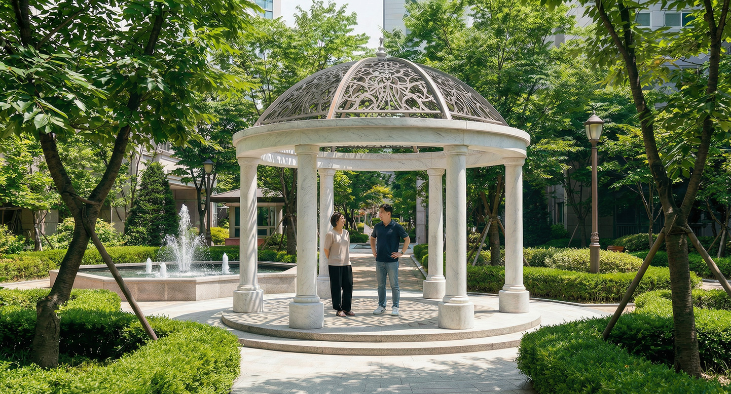 화이트 아트 로툰다(WHITE ART ROTUNDA)|DAUM-P-611A 제품목록으로 바로가기 자료 및 바로가기 나라장터 바로연결 도면 다운로드 시공사진 보러가기 기타 깨끗한 화이트 석재 기둥과 블랙 톤의 넝쿨무늬 돔이 세련된 대비를 이루는 로툰다 모델입니다. 개방감 있는 원형 구조가 주변 조경과 우아하게 어우러지며, 웨딩 가든이나 휴식 정원에 로맨틱한 분위기를 더해줍니다. 제품명 화이트 아트 로툰다(WHITE ART ROTUNDA)|DAUM-P-611A 물품식별번호 25031351 규격 4,600 X 4,600 X 4,000(H) 재질 stl, al-casting, 화강석 화이트 아트 로툰다(WHITE ART ROTUNDA)|DAUM-P-611A 물품식별번호 25031351 규격 4,600 X 4,600 X 4,000(H) 재질 stl, al-casting, 화강석 기타 깨끗한 화이트 석재 기둥과 블랙 톤의 넝쿨무늬 돔이 세련된 대비를 이루는 로툰다 모델입니다. 개방감 있는 원형 구조가 주변 조경과 우아하게 어우러지며, 웨딩 가든이나 휴식 정원에 로맨틱한 분위기를 더해줍니다. 자료 및 바로가기 나라장터 바로연결 도면 다운로드 시공사진 보러가기