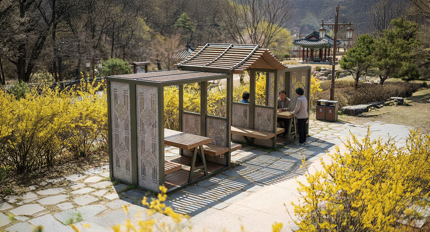 앤틱 듀오 하우스(ANTIQUE DUO HOUSE)|DAUMP-429M-1 제품목록으로 바로가기 자료 및 바로가기 나라장터 바로연결 도면 다운로드 시공사진 보러가기 기타 정교한 전통 문양 패널이 돋보이는 두 개의 박스형 유닛이 박공지붕 통로로 이어진 형태입니다. 고전적인 우아함과 현대적인 모듈러 구조가 결합된 프리미엄 조형 공간입니다. 제품명 앤틱 듀오 하우스(ANTIQUE DUO HOUSE)|DAUMP-429M-1 물품식별번호 25530470 규격 6,300 X 2,200 X 2,750(H) 재질 stl, hard wood, pc, hpl 앤틱 듀오 하우스(ANTIQUE DUO HOUSE)|DAUMP-429M-1 물품식별번호 25530470 규격 6,300 X 2,200 X 2,750(H) 재질 stl, hard wood, pc, hpl 기타 정교한 전통 문양 패널이 돋보이는 두 개의 박스형 유닛이 박공지붕 통로로 이어진 형태입니다. 고전적인 우아함과 현대적인 모듈러 구조가 결합된 프리미엄 조형 공간입니다. 자료 및 바로가기 나라장터 바로연결 도면 다운로드 시공사진 보러가기