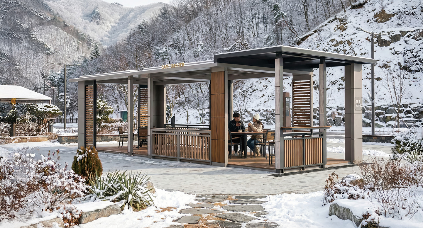 메트로 폴리탄 카페(METROPOLITAN CAFE)|DAUM-P-2746 제품목록으로 바로가기 자료 및 바로가기 나라장터 바로연결 도면 다운로드 시공사진 보러가기 기타 도심 속 고급 카페를 그대로 옮겨 놓은 듯한 세련된 직선미가 돋보입니다. 효율적인 공간 구성과 모던한 루버 디자인이 어우러져, 커피 한 잔의 여유와 함께 비즈니스 미팅이나 독서 등 다양한 활동이 가능한 스마트 티하우스입니다. 제품명 메트로 폴리탄 카페(METROPOLITAN CAFE)|DAUM-P-2746 물품식별번호 25939142 규격 10,000 × 4,200 × 3,000(H) 재질 stl, galvanized, hard wood, polycarbonate, hpl 메트로 폴리탄 카페(METROPOLITAN CAFE)|DAUM-P-2746 물품식별번호 25939142 규격 10,000 × 4,200 × 3,000(H) 재질 stl, galvanized, hard wood, polycarbonate, hpl 기타 도심 속 고급 카페를 그대로 옮겨 놓은 듯한 세련된 직선미가 돋보입니다. 효율적인 공간 구성과 모던한 루버 디자인이 어우러져, 커피 한 잔의 여유와 함께 비즈니스 미팅이나 독서 등 다양한 활동이 가능한 스마트 티하우스입니다. 자료 및 바로가기 나라장터 바로연결 도면 다운로드 시공사진 보러가기