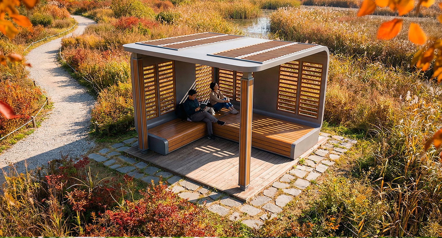 어반 쉘 플러스(URBAN SHELL PLUS)|DAUM-P-116A 제품목록으로 바로가기 자료 및 바로가기 나라장터 바로연결 도면 다운로드 시공사진 보러가기 기타 유려한 곡선으로 마감된 실버 일체형 프레임과 다크 우드 루버 스크린이 조화를 이루어 모던하고 아늑한 분위기를 선사합니다. 배면을 감싸는 쉘터 구조 내부에 광폭 평상을 설계하여 단지 내 공간에 프라이빗하고 품격 있는 프리미엄 휴식처를 제공합니다. 제품명 어반 쉘 플러스(URBAN SHELL PLUS)|DAUM-P-116A 물품식별번호 25025018 규격 3,400 X 3,800 X 2,800(H) 재질 stl, galvanized, hard wood, polycarbonate 어반 쉘 플러스(URBAN SHELL PLUS)|DAUM-P-116A 물품식별번호 25025018 규격 3,400 X 3,800 X 2,800(H) 재질 stl, galvanized, hard wood, polycarbonate 기타 유려한 곡선으로 마감된 실버 일체형 프레임과 다크 우드 루버 스크린이 조화를 이루어 모던하고 아늑한 분위기를 선사합니다. 배면을 감싸는 쉘터 구조 내부에 광폭 평상을 설계하여 단지 내 공간에 프라이빗하고 품격 있는 프리미엄 휴식처를 제공합니다. 자료 및 바로가기 나라장터 바로연결 도면 다운로드 시공사진 보러가기