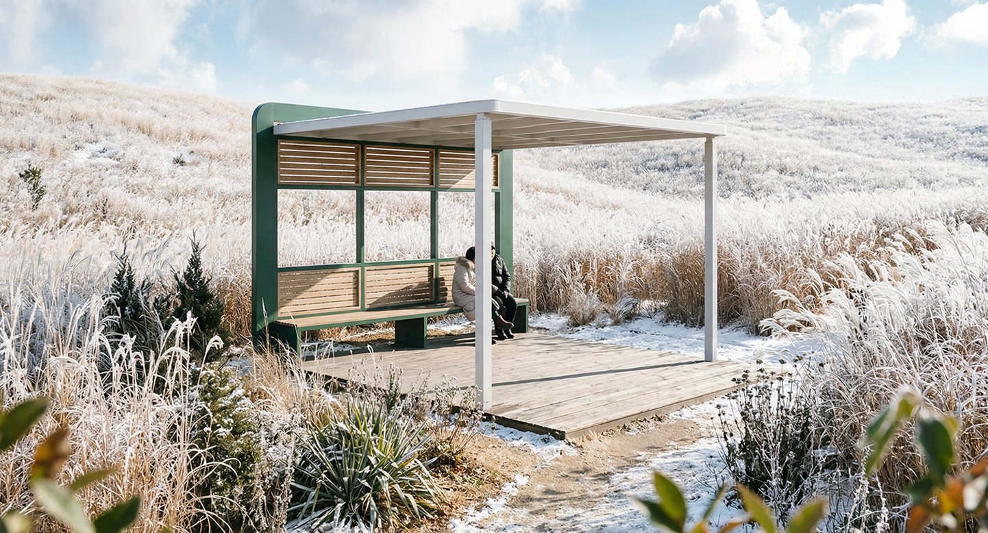포레스트 윈도우 플러스(FOREST WINDOW PLUS)|DAUM-P-1162 제품목록으로 바로가기 자료 및 바로가기 나라장터 바로연결 도면 다운로드 시공사진 보러가기 기타 모서리가 둥글게 처리된 딥그린 컬러의 배면 아트월이 시각적인 안정감과 세련된 인상을 선사합니다. 상하로 분할된 목재 루버 패널과 탁 트인 개구부, 그리고 일체형 광폭 벤치를 통해 단지 내 공간에 독립적이면서도 쾌적한 프리미엄 휴식처를 제공합니다. 제품명 포레스트 윈도우 플러스(FOREST WINDOW PLUS)|DAUM-P-1162 물품식별번호 25018073 규격 3,800 X 3,800 X 2,625(H) 재질 stl, galvanized, hard wood, polycarbonate, hpl 포레스트 윈도우 플러스(FOREST WINDOW PLUS)|DAUM-P-1162 물품식별번호 25018073 규격 3,800 X 3,800 X 2,625(H) 재질 stl, galvanized, hard wood, polycarbonate, hpl 기타 모서리가 둥글게 처리된 딥그린 컬러의 배면 아트월이 시각적인 안정감과 세련된 인상을 선사합니다. 상하로 분할된 목재 루버 패널과 탁 트인 개구부, 그리고 일체형 광폭 벤치를 통해 단지 내 공간에 독립적이면서도 쾌적한 프리미엄 휴식처를 제공합니다. 자료 및 바로가기 나라장터 바로연결 도면 다운로드 시공사진 보러가기