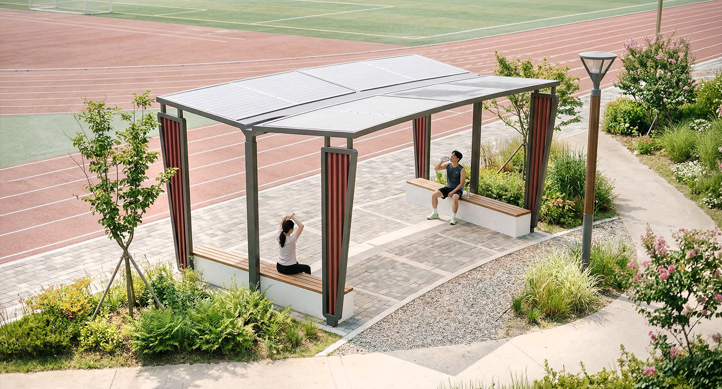 강렬한 레드 컬러의 조형 루버 포스트와 다크 그레이 프레임이 대비를 이루어 압도적인 존재감을 선사합니다. 광활한 인피니티급 오픈 프레임 아래 와이드 벤치를 배치하여, 단지 내 대규모 광장에서도 시원한 개방감과 여유로운 휴식 환경을 동시에 제공하는 프리미엄 커뮤니티 거점입니다.