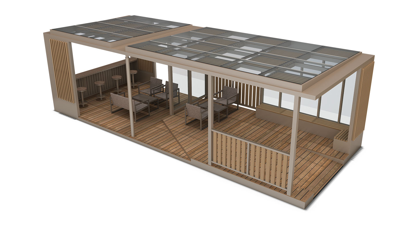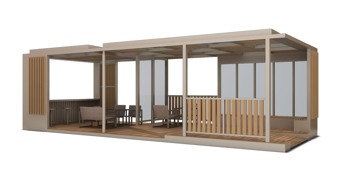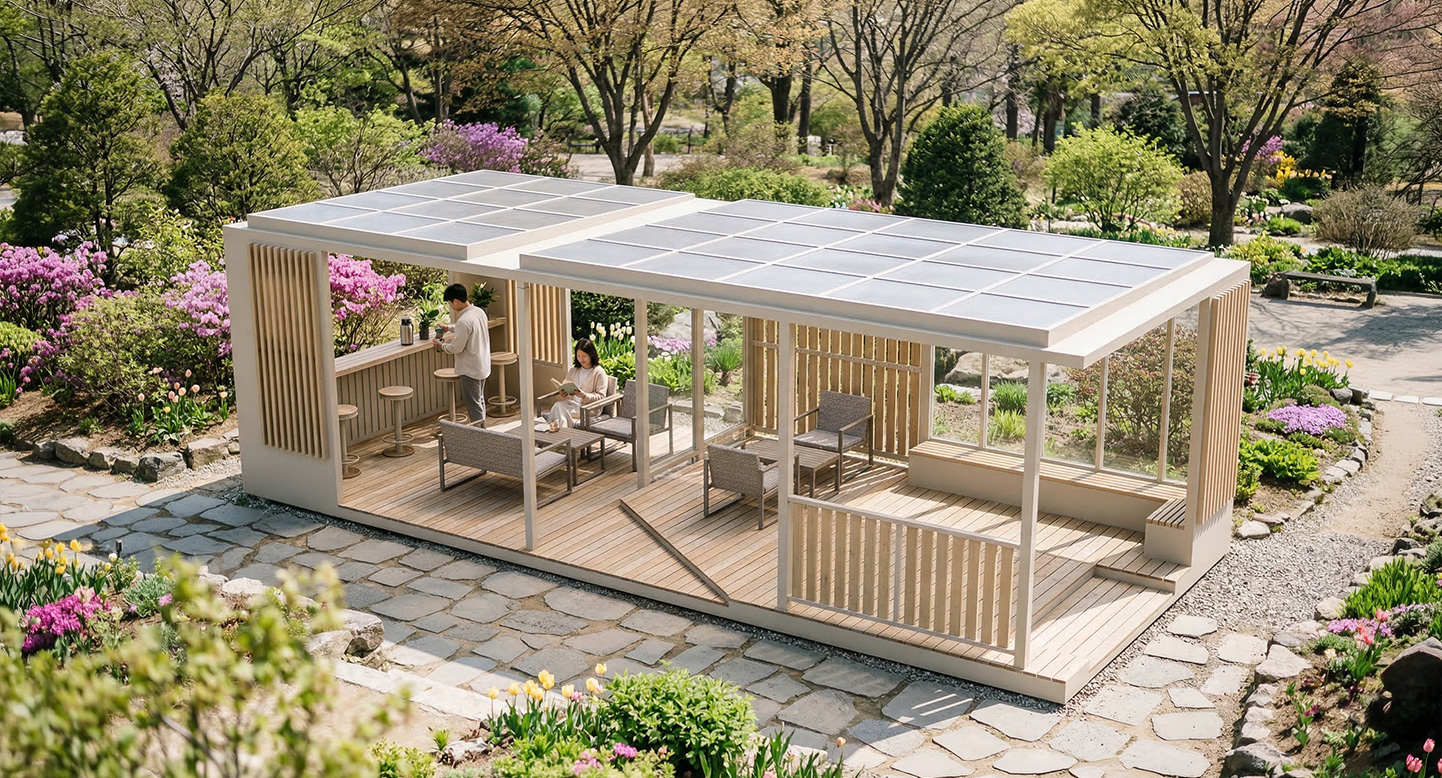 오픈 카페 라운지 홀 프라임 (OPEN CAFE LOUNGE HALL PRIME)|DAUM-P-772 제품목록으로 바로가기 자료 및 바로가기 나라장터 바로연결 도면 다운로드 시공사진 보러가기 기타 베이지 톤의 차분한 프레임과 전면 평상형 데크가 어우러져 고급스러운 테라스 카페 분위기를 연출합니다. 내부 바 테이블과 독립된 라운지 소파 공간을 구성하여, 단지 내에서 입주민들이 사계절 내내 여유롭게 소통하며 머물 수 있는 프리미엄 커뮤니티 거점을 제공합니다. 제품명 오픈 카페 라운지 홀 프라임 (OPEN CAFE LOUNGE HALL PRIME)|DAUM-P-772 물품식별번호 25022282 규격 10,000 X 4,000 X 3,070(H) 재질 stl, galvanized, hard wood, polycarbonate 오픈 카페 라운지 홀 프라임 (OPEN CAFE LOUNGE HALL PRIME)|DAUM-P-772 물품식별번호 25022282 규격 10,000 X 4,000 X 3,070(H) 재질 stl, galvanized, hard wood, polycarbonate 기타 베이지 톤의 차분한 프레임과 전면 평상형 데크가 어우러져 고급스러운 테라스 카페 분위기를 연출합니다. 내부 바 테이블과 독립된 라운지 소파 공간을 구성하여, 단지 내에서 입주민들이 사계절 내내 여유롭게 소통하며 머물 수 있는 프리미엄 커뮤니티 거점을 제공합니다. 자료 및 바로가기 나라장터 바로연결 도면 다운로드 시공사진 보러가기