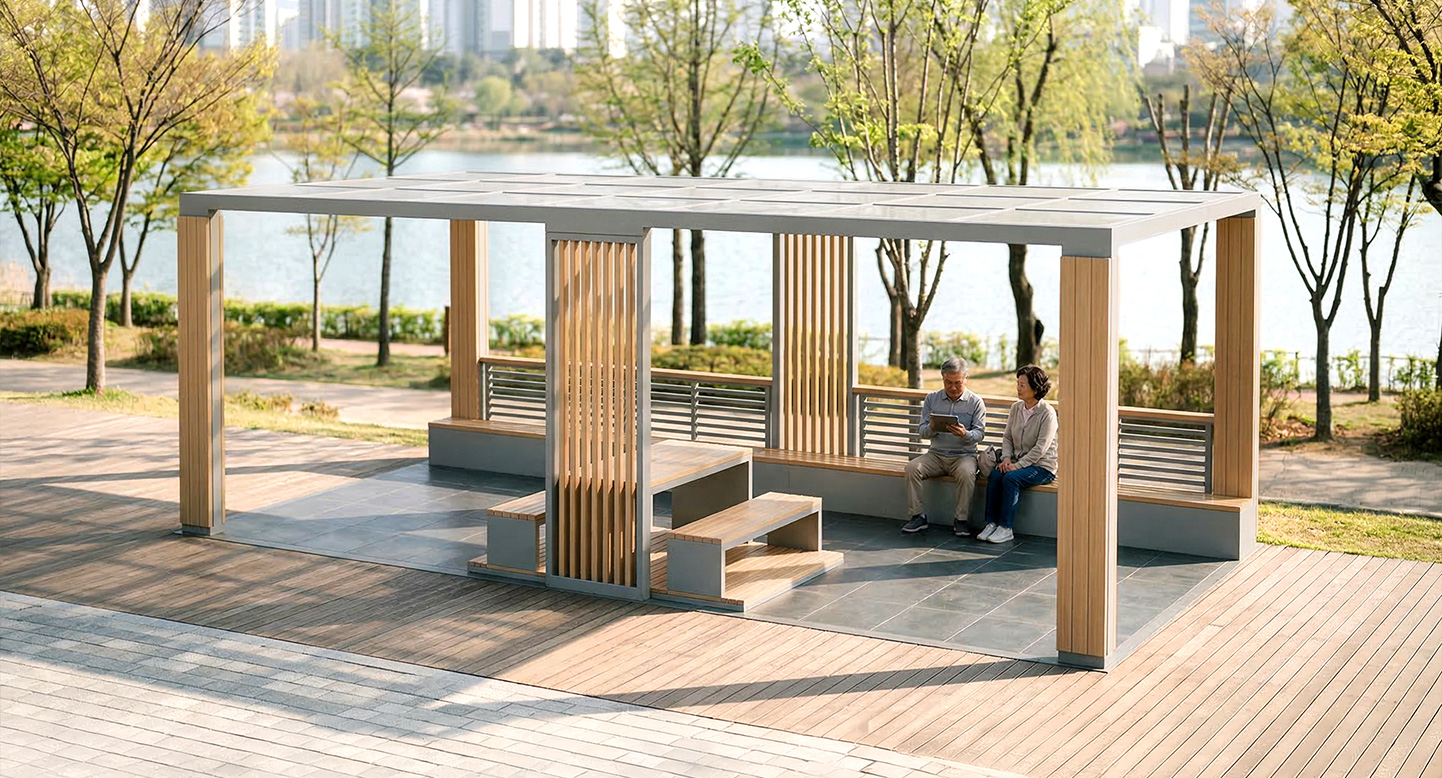실버 루버 테이블 홀 프라임 (SILVER LOUVER TABLE HALL PRIME)|DAUM-P-781B 제품목록으로 바로가기 자료 및 바로가기 나라장터 바로연결 도면 다운로드 시공사진 보러가기 기타 도시적인 실버 그레이 프레임과 정갈한 수직 루버 포스트가 어우러져 현대적이고 신뢰감 있는 경관을 연출합니다. 루프 아래 독립적인 테이블 세트와 배면 전체를 활용한 통합형 벤치를 효율적으로 배치하여, 단지 내 광장이나 휴게 정원에 안락한 커뮤니티 거점을 제공합니다. 제품명 실버 루버 테이블 홀 프라임 (SILVER LOUVER TABLE HALL PRIME)|DAUM-P-781B 물품식별번호 25022413 규격 7,500 X 3,800 X 2,666(H) 재질 stl, galvanized, hard wood, polycarbonate, hpl 실버 루버 테이블 홀 프라임 (SILVER LOUVER TABLE HALL PRIME)|DAUM-P-781B 물품식별번호 25022413 규격 7,500 X 3,800 X 2,666(H) 재질 stl, galvanized, hard wood, polycarbonate, hpl 기타 도시적인 실버 그레이 프레임과 정갈한 수직 루버 포스트가 어우러져 현대적이고 신뢰감 있는 경관을 연출합니다. 루프 아래 독립적인 테이블 세트와 배면 전체를 활용한 통합형 벤치를 효율적으로 배치하여, 단지 내 광장이나 휴게 정원에 안락한 커뮤니티 거점을 제공합니다. 자료 및 바로가기 나라장터 바로연결 도면 다운로드 시공사진 보러가기