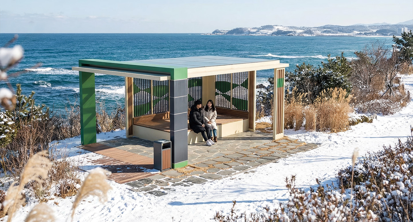 프레시루프 홀 프라임(FRESH-ROOF HALL PRIME)|DAUM-P-791 제품목록으로 바로가기 자료 및 바로가기 나라장터 바로연결 도면 다운로드 시공사진 보러가기 기타 선명한 그린 컬러의 L자형 프레임이 공간에 활력을 줍니다. 짙은 컬러 기둥과 대비를 이루며 모던하면서도 생동감 넘치는 분위기를 연출하여, 산책로 입구나 공원 중심에 잘 어울리는 프레시한 쉼터입니다. 제품명 프레시루프 홀 프라임(FRESH-ROOF HALL PRIME)|DAUM-P-791 물품식별번호 25022674 규격 6,000 X 4,000 X 2,800(H) 재질 stl, galvanized, hard wood, polycarbonate 프레시루프 홀 프라임(FRESH-ROOF HALL PRIME)|DAUM-P-791 물품식별번호 25022674 규격 6,000 X 4,000 X 2,800(H) 재질 stl, galvanized, hard wood, polycarbonate 기타 선명한 그린 컬러의 L자형 프레임이 공간에 활력을 줍니다. 짙은 컬러 기둥과 대비를 이루며 모던하면서도 생동감 넘치는 분위기를 연출하여, 산책로 입구나 공원 중심에 잘 어울리는 프레시한 쉼터입니다. 자료 및 바로가기 나라장터 바로연결 도면 다운로드 시공사진 보러가기