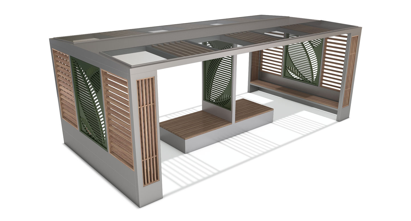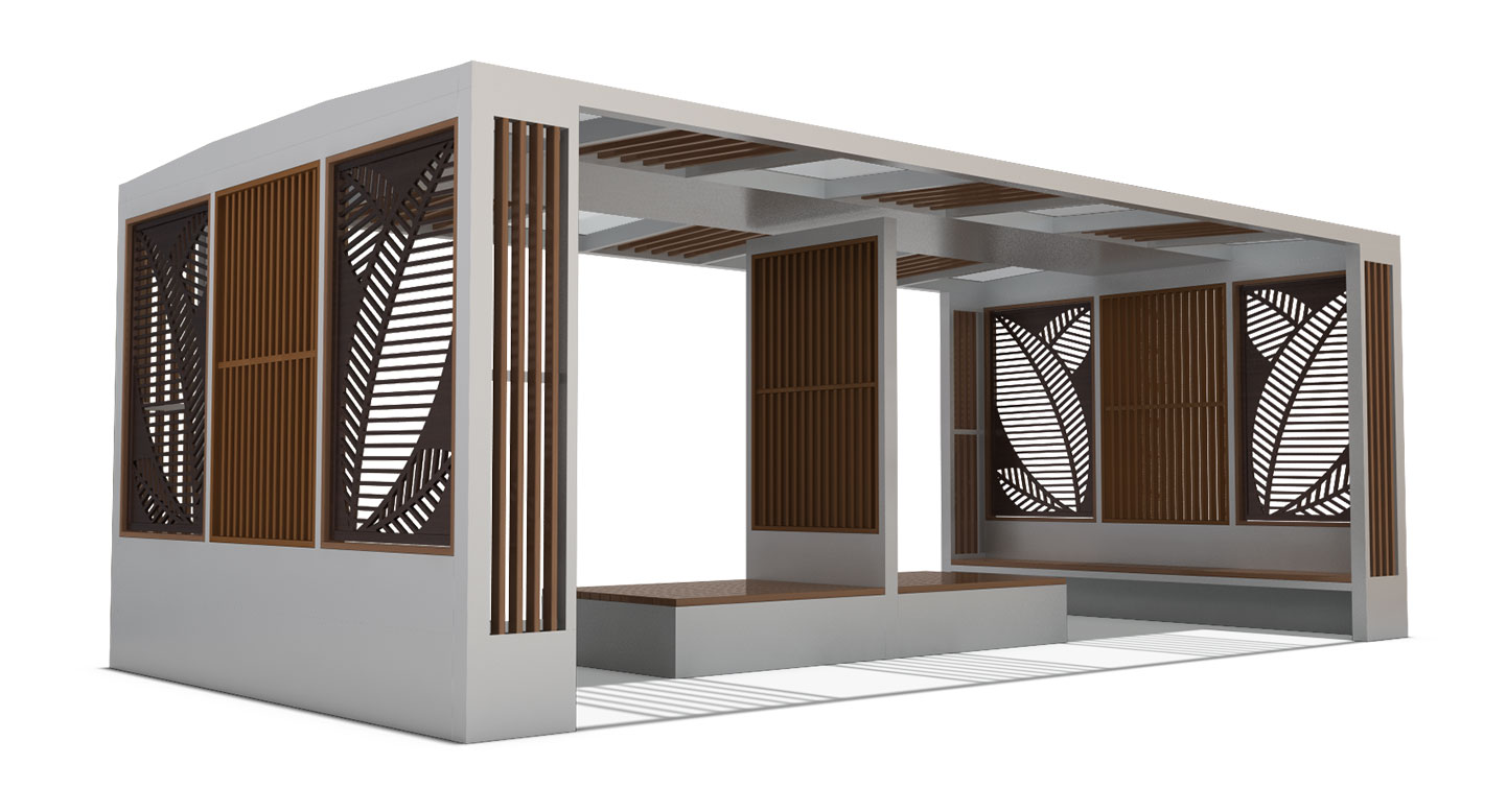 소셜 테라스 홀 프라임(SOCIAL TERRACE HALL PRIME)|DAUM-P-786 제품목록으로 바로가기 자료 및 바로가기 나라장터 바로연결 도면 다운로드 시공사진 보러가기 기타 정교한 나뭇잎 패턴의 아트월과 따뜻한 질감의 루버 스크린이 조화를 이루어 자연 친화적인 감성을 선사합니다. 와이드 프레임 내부에 대형 평상과 벤치를 통합 설계하여 다수가 안락하게 머물 수 있는 고품격 프리미엄 복합 휴게 공간을 제공합니다. 제품명 소셜 테라스 홀 프라임(SOCIAL TERRACE HALL PRIME)|DAUM-P-786 물품식별번호 25022608 규격 7,000 X 3,600 X 2,650(H) 재질 stl, galvanized, hard wood, polycarbonate, hp 소셜 테라스 홀 프라임(SOCIAL TERRACE HALL PRIME)|DAUM-P-786 물품식별번호 25022608 규격 7,000 X 3,600 X 2,650(H) 재질 stl, galvanized, hard wood, polycarbonate, hp 기타 정교한 나뭇잎 패턴의 아트월과 따뜻한 질감의 루버 스크린이 조화를 이루어 자연 친화적인 감성을 선사합니다. 와이드 프레임 내부에 대형 평상과 벤치를 통합 설계하여 다수가 안락하게 머물 수 있는 고품격 프리미엄 복합 휴게 공간을 제공합니다. 자료 및 바로가기 나라장터 바로연결 도면 다운로드 시공사진 보러가기