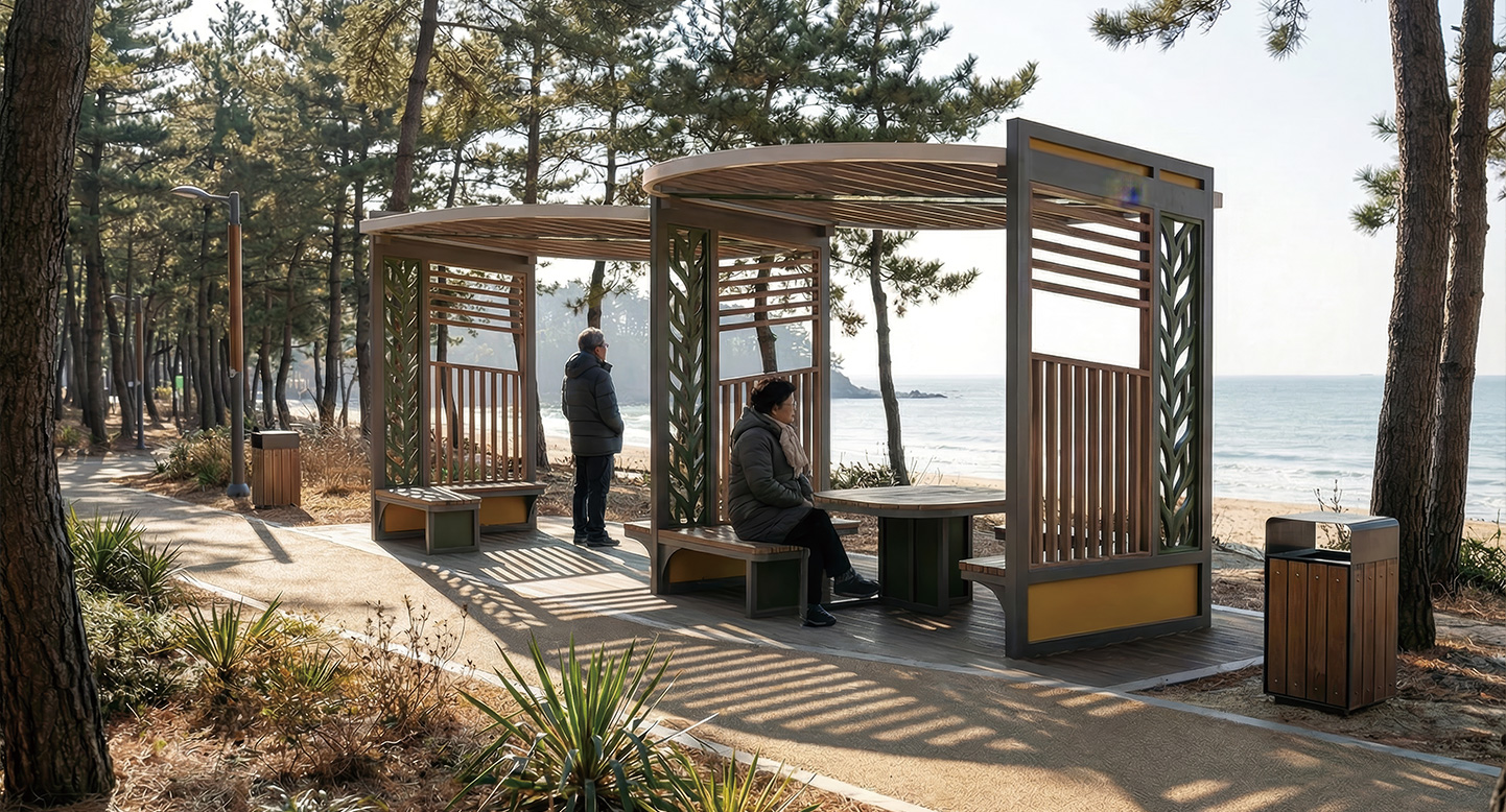 리프 링크 쉘터(LEAF LINK SHELTER)|DAUM-P-428M-1 제품목록으로 바로가기 자료 및 바로가기 나라장터 바로연결 도면 다운로드 시공사진 보러가기 기타 나뭇잎 모티프의 조형 유닛 두 개를 연결하여 대형 휴게 공간을 형성했습니다. 지그재그로 배치된 구조가 시각적 즐거움을 주며, 다수의 인원이 동시에 머물 수 있는 확장형 조형 퍼걸러입니다. 제품명 리프 링크 쉘터(LEAF LINK SHELTER)|DAUM-P-428M-1 물품식별번호 24161847 규격 5,225 X 3,650 X 2,808(H) 재질 stl, hard wood, polycarbonate, galvanized, birchplywood 리프 링크 쉘터(LEAF LINK SHELTER)|DAUM-P-428M-1 물품식별번호 24161847 규격 5,225 X 3,650 X 2,808(H) 재질 stl, hard wood, polycarbonate, galvanized, birchplywood 기타 나뭇잎 모티프의 조형 유닛 두 개를 연결하여 대형 휴게 공간을 형성했습니다. 지그재그로 배치된 구조가 시각적 즐거움을 주며, 다수의 인원이 동시에 머물 수 있는 확장형 조형 퍼걸러입니다. 자료 및 바로가기 나라장터 바로연결 도면 다운로드 시공사진 보러가기