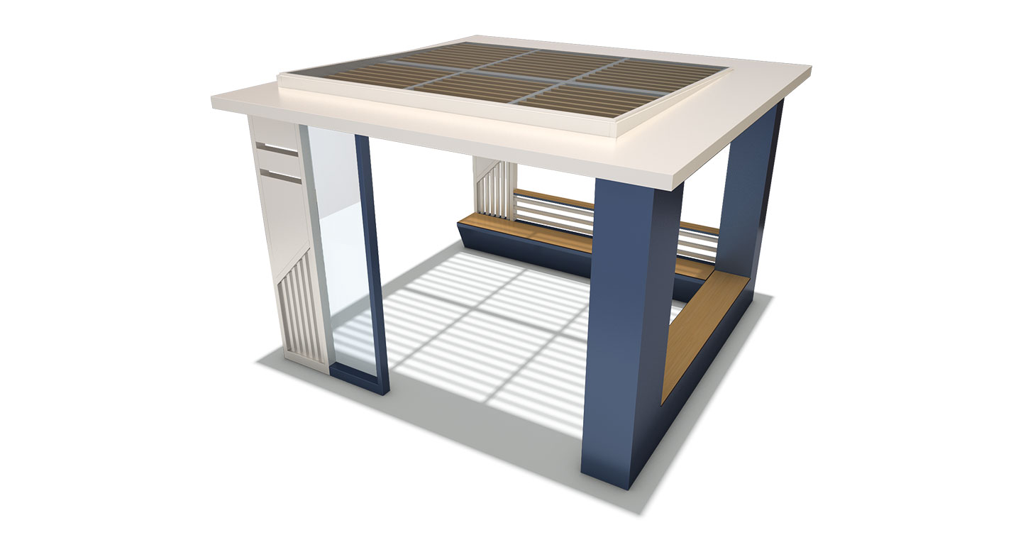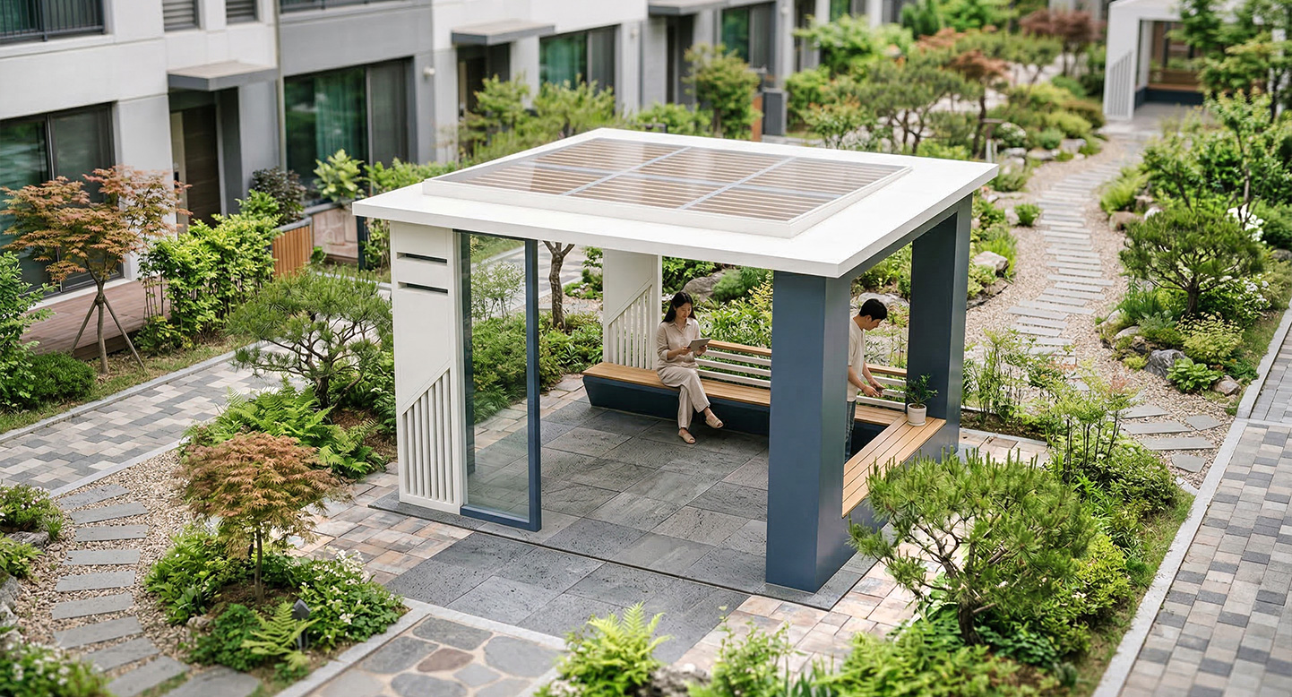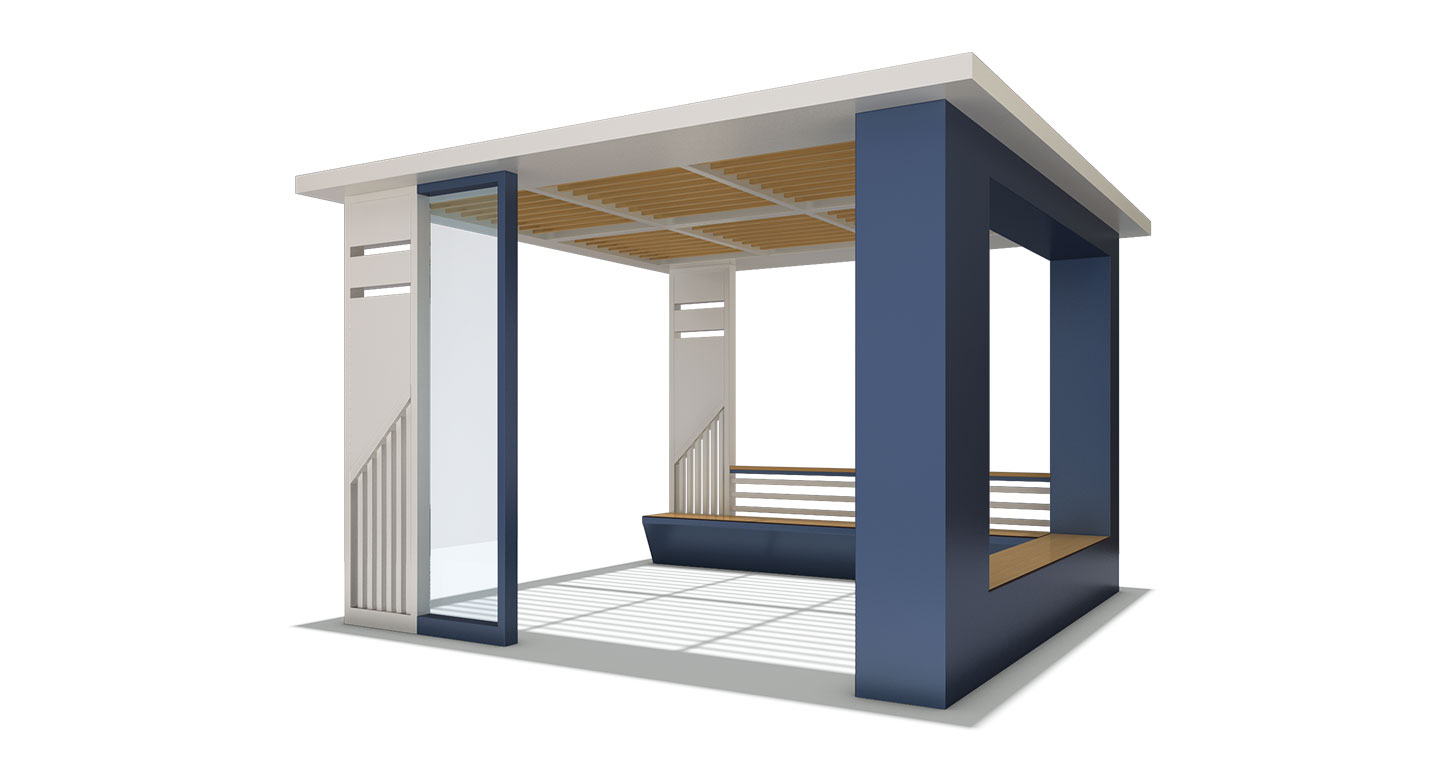 볼륨감 있는 블루 톤의 사각 프레임과 화이트 포인트 벽체가 조화를 이루어 현대적이고 정갈한 공간미를 완성합니다. 전면의 투명 유리 스크린과 루버 디자인이 결합된 입체적인 구조 내부에 안락한 코너 벤치를 배치하여, 단지 내 휴게 공간에 세련되고 프라이빗한 프리미엄 쉼터를 제공합니다.