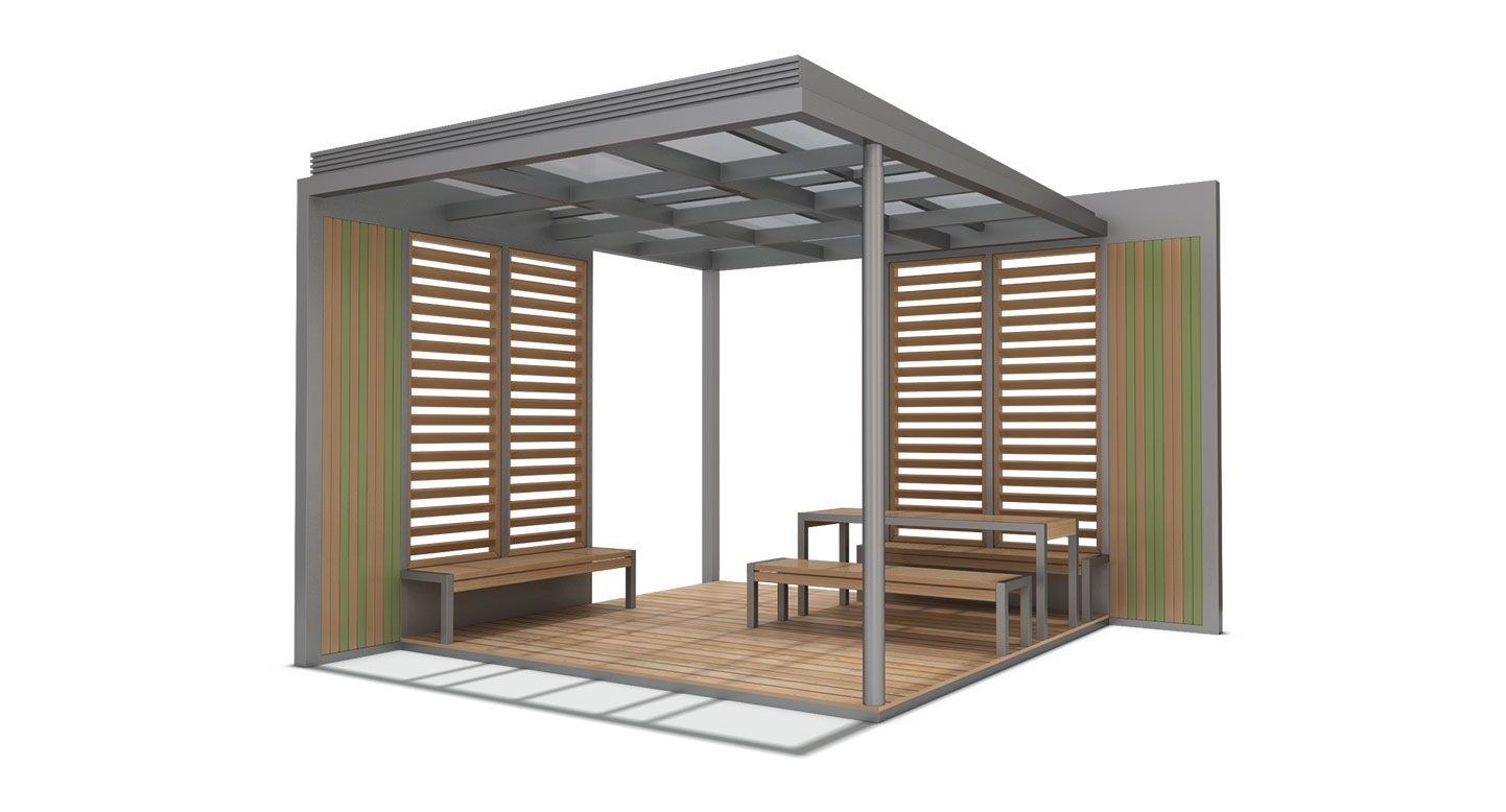 우드 라운지 플러스 (WOOD LOUNGE PLUS)DAUM-P-195 제품목록으로 바로가기 자료 및 바로가기 나라장터 바로연결 도면 다운로드 시공사진 보러가기 기타 와이드한 목재 데크와 루버 스크린이 어우러져 도심 속 아늑한 테라스 감성을 선사합니다. 세련된 그레이 프레임 아래로 등받이 벤치와 독립형 테이블 세트를 구성하여, 단지 내 휴게 공간에 소규모 모임과 휴식을 동시에 즐길 수 있는 프리미엄 오픈 라운지를 제공합니다. 제품명 우드 라운지 플러스 (WOOD LOUNGE PLUS)DAUM-P-195 물품식별번호 25017782 규격 4,000 X 4,000 X 2,900(H) 재질 stl, galvanized, hard wood, polycarbonate 우드 라운지 플러스 (WOOD LOUNGE PLUS)DAUM-P-195 물품식별번호 25017782 규격 4,000 X 4,000 X 2,900(H) 재질 stl, galvanized, hard wood, polycarbonate 기타 와이드한 목재 데크와 루버 스크린이 어우러져 도심 속 아늑한 테라스 감성을 선사합니다. 세련된 그레이 프레임 아래로 등받이 벤치와 독립형 테이블 세트를 구성하여, 단지 내 휴게 공간에 소규모 모임과 휴식을 동시에 즐길 수 있는 프리미엄 오픈 라운지를 제공합니다. 자료 및 바로가기 나라장터 바로연결 도면 다운로드 시공사진 보러가기