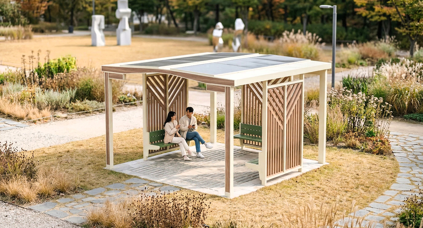 브이 라인 쉘터(V-LINE SHELTER)|DAUM-P-1122 제품목록으로 바로가기 자료 및 바로가기 나라장터 바로연결 도면 다운로드 시공사진 보러가기 기타 기둥과 스크린에 적용된 수직·사선 우드 패턴이 숲의 나무를 형상화한 듯한 내추럴한 조형미를 선사합니다. 차분한 아이보리 프레임과 싱그러운 그린 컬러 벤치를 매치하여 단지 내 산책로나 휴게 공간에 자연 친화적이고 편안한 프리미엄 쉼터를 제공합니다. 제품명 브이 라인 쉘터(V-LINE SHELTER)|DAUM-P-1122 물품식별번호 25018007 규격 4,000 X 4,000 X 2,600(H) 재질 stl, galvanized, hard wood, polycarbonate 브이 라인 쉘터(V-LINE SHELTER)|DAUM-P-1122 물품식별번호 25018007 규격 4,000 X 4,000 X 2,600(H) 재질 stl, galvanized, hard wood, polycarbonate 기타 기둥과 스크린에 적용된 수직·사선 우드 패턴이 숲의 나무를 형상화한 듯한 내추럴한 조형미를 선사합니다. 차분한 아이보리 프레임과 싱그러운 그린 컬러 벤치를 매치하여 단지 내 산책로나 휴게 공간에 자연 친화적이고 편안한 프리미엄 쉼터를 제공합니다. 자료 및 바로가기 나라장터 바로연결 도면 다운로드 시공사진 보러가기