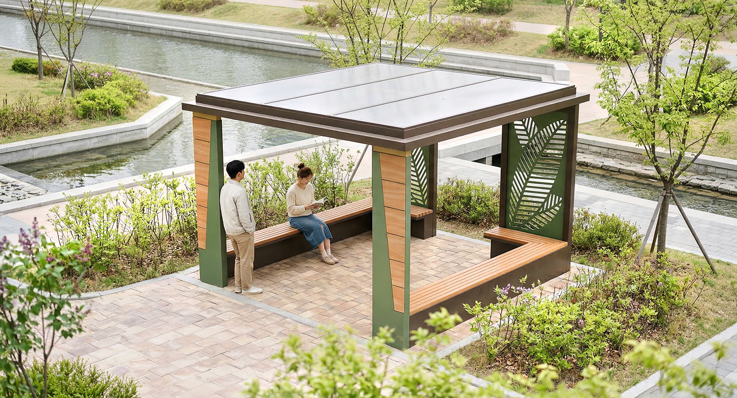 리프 가든 플러스(LEAF GARDEN PLUS)|DAUM-P-1132 제품목록으로 바로가기 자료 및 바로가기 나라장터 바로연결 도면 다운로드 시공사진 보러가기 기타 기둥 전면의 우드 패널과 그린 컬러의 사선 포인트가 조화를 이루어 자연 친화적이고 역동적인 미감을 선사합니다. 배면에 적용된 상징적인 나뭇잎 패턴 타공 스크린과 내부의 'ㄴ'자형 코너 벤치를 통해, 단지 내 공간에 싱그럽고 아늑한 프리미엄 숲속 쉼터를 제공합니다. 제품명 리프 가든 플러스(LEAF GARDEN PLUS)|DAUM-P-1132 물품식별번호 25018037 규격 4,000 X 4,000 X 2,600(H) 재질 stl, galvanized, hard wood, polycarbonate, hpl 리프 가든 플러스(LEAF GARDEN PLUS)|DAUM-P-1132 물품식별번호 25018037 규격 4,000 X 4,000 X 2,600(H) 재질 stl, galvanized, hard wood, polycarbonate, hpl 기타 기둥 전면의 우드 패널과 그린 컬러의 사선 포인트가 조화를 이루어 자연 친화적이고 역동적인 미감을 선사합니다. 배면에 적용된 상징적인 나뭇잎 패턴 타공 스크린과 내부의 'ㄴ'자형 코너 벤치를 통해, 단지 내 공간에 싱그럽고 아늑한 프리미엄 숲속 쉼터를 제공합니다. 자료 및 바로가기 나라장터 바로연결 도면 다운로드 시공사진 보러가기