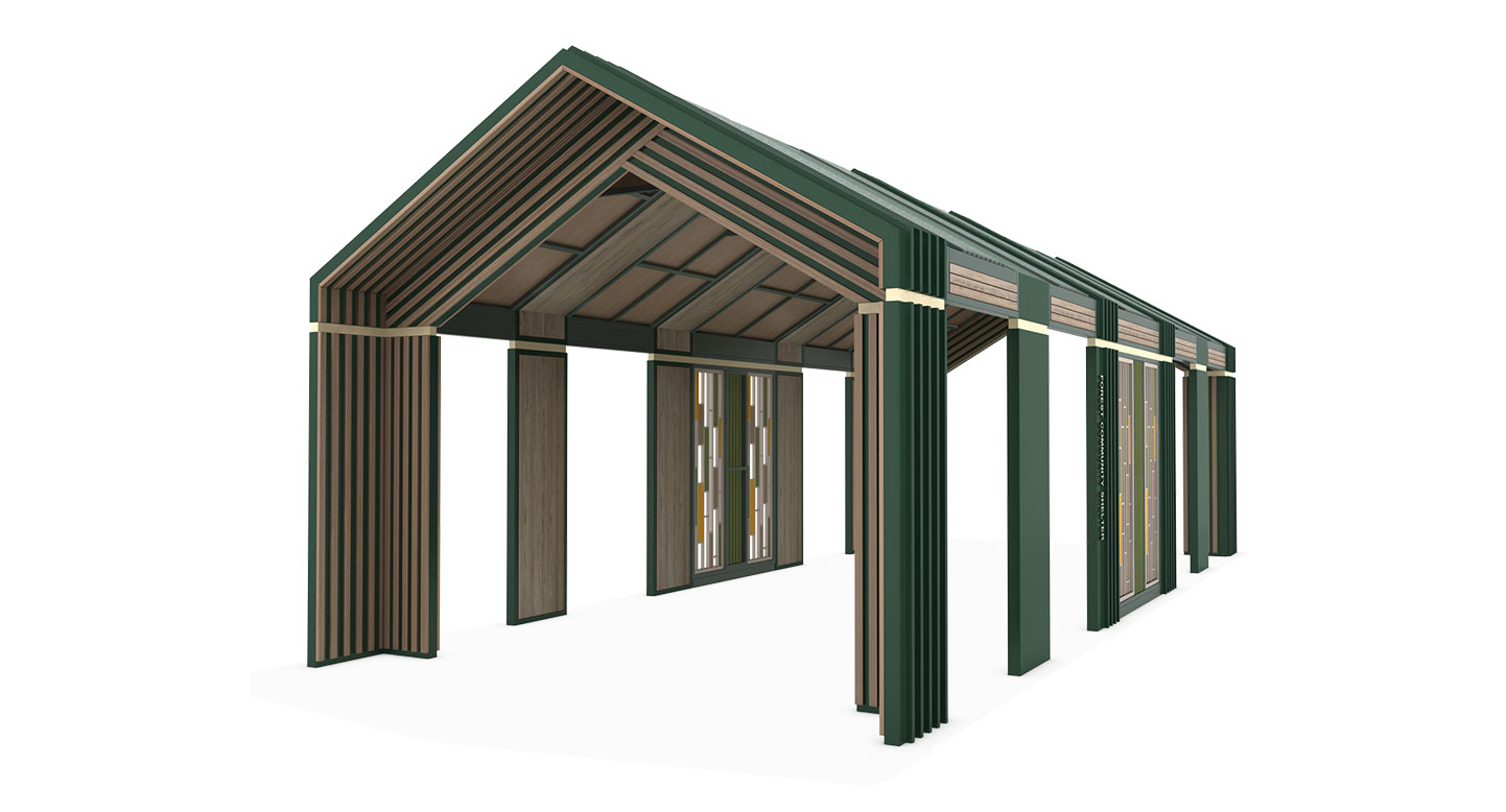 트라이프 테라스 홀(TRIPE TERRACE HALL)|DAUM-P-2768 제품목록으로 바로가기 자료 및 바로가기 나라장터 바로연결 도면 다운로드 시공사진 보러가기 기타 박공 지붕 아래 하나의 ‘열린 홀’ 같은 공간을 구성한 대형 기본형 모델입니다. 딥그린 컬러와 모자이크 패턴 포인트가 자연 환경과 조화롭게 어우러지며, 야외 학습·운동·커뮤니티 활동을 유연하게 수용하는 심플 모던 쉘터로 계획되었습니다. 제품명 트라이프 테라스 홀(TRIPE TERRACE HALL)|DAUM-P-2768 물품식별번호 25939660 규격 13,000X 5,000 X 4,373(H) 재질 stl, galvanized, hard wood, polycarbonate, hpl 트라이프 테라스 홀(TRIPE TERRACE HALL)|DAUM-P-2768 물품식별번호 25939660 규격 13,000X 5,000 X 4,373(H) 재질 stl, galvanized, hard wood, polycarbonate, hpl 기타 박공 지붕 아래 하나의 ‘열린 홀’ 같은 공간을 구성한 대형 기본형 모델입니다. 딥그린 컬러와 모자이크 패턴 포인트가 자연 환경과 조화롭게 어우러지며, 야외 학습·운동·커뮤니티 활동을 유연하게 수용하는 심플 모던 쉘터로 계획되었습니다. 자료 및 바로가기 나라장터 바로연결 도면 다운로드 시공사진 보러가기