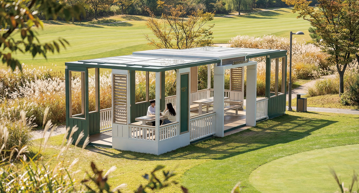 그리너리라운지 홀 프라임(GREENERY-LOUNGE HALL PRIME)|DAUM-P-2722 제품목록으로 바로가기 자료 및 바로가기 나라장터 바로연결 도면 다운로드 시공사진 보러가기 기타 깊이감 있는 딥 그린과 화이트 프레임이 조화를 이룬 클래식한 티하우스 디자인입니다. 웨인스코팅 스타일의 벽체와 개방형 창이 이국적인 정취를 자아내며, 단지 내 정원에서 차 한 잔의 여유를 즐기는 고품격 휴게 공간을 제공합니다. 제품명 그리너리라운지 홀 프라임(GREENERY-LOUNGE HALL PRIME)|DAUM-P-2722 물품식별번호 25939122 규격 10,000 × 4,300 × 2,770(H) 재질 stl, galvanized, hard wood, polycarbonate, hpl 그리너리라운지 홀 프라임(GREENERY-LOUNGE HALL PRIME)|DAUM-P-2722 물품식별번호 25939122 규격 10,000 × 4,300 × 2,770(H) 재질 stl, galvanized, hard wood, polycarbonate, hpl 기타 깊이감 있는 딥 그린과 화이트 프레임이 조화를 이룬 클래식한 티하우스 디자인입니다. 웨인스코팅 스타일의 벽체와 개방형 창이 이국적인 정취를 자아내며, 단지 내 정원에서 차 한 잔의 여유를 즐기는 고품격 휴게 공간을 제공합니다. 자료 및 바로가기 나라장터 바로연결 도면 다운로드 시공사진 보러가기
