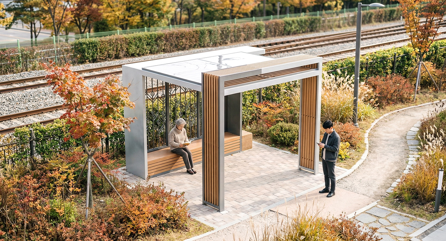 업라이트 에지 베이직(UPRIGHT EDGE BASIC)|DAUM-P-108A 제품목록으로 바로가기 자료 및 바로가기 나라장터 바로연결 도면 다운로드 시공사진 보러가기 기타 상부로 솟아오른 사선형 기둥이 구조를 역동적으로 감싸는 사각 소형 기본형으로, 짙은 그레이 프레임과 정교한 우드 디테일이 결합되어 단지 내 휴식 공간에 독창적이면서도 세련된 건축적 포인트를 더합니다. 제품명 업라이트 에지 베이직(UPRIGHT EDGE BASIC)|DAUM-P-108A 물품식별번호 25025015 규격 4,100 X 3,600 X 3,100(H) 재질 stl, galvanized, hard wood, polycarbonate 업라이트 에지 베이직(UPRIGHT EDGE BASIC)|DAUM-P-108A 물품식별번호 25025015 규격 4,100 X 3,600 X 3,100(H) 재질 stl, galvanized, hard wood, polycarbonate 기타 상부로 솟아오른 사선형 기둥이 구조를 역동적으로 감싸는 사각 소형 기본형으로, 짙은 그레이 프레임과 정교한 우드 디테일이 결합되어 단지 내 휴식 공간에 독창적이면서도 세련된 건축적 포인트를 더합니다. 자료 및 바로가기 나라장터 바로연결 도면 다운로드 시공사진 보러가기