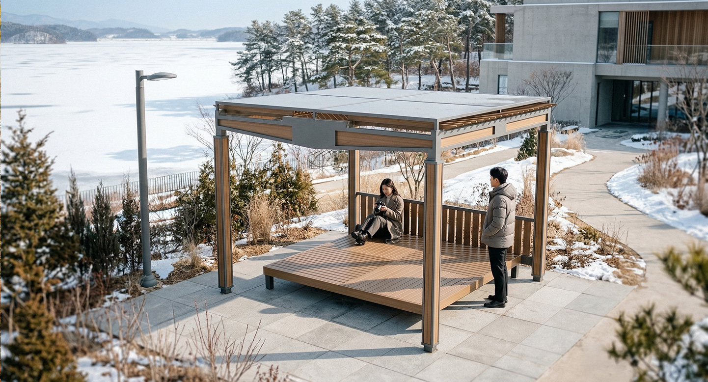 어반 포인트 베이직(URBAN POINT BASIC)|DAUM-P-132-1 제품목록으로 바로가기 자료 및 바로가기 나라장터 바로연결 도면 다운로드 시공사진 보러가기 기타 상부로 솟아오른 사선형 기둥이 구조를 역동적으로 감싸는 사각 소형 기본형으로, 짙은 그레이 프레임과 정교한 우드 디테일이 결합되어 단지 내 휴식 공간에 독창적이면서도 세련된 건축적 포인트를 더합니다. 제품명 어반 포인트 베이직(URBAN POINT BASIC)|DAUM-P-132-1 물품식별번호 23294928 규격 4,000 X 4,000 X 2,955(H) 재질 stl, birch plywood, hard wood, polycarbonate 어반 포인트 베이직(URBAN POINT BASIC)|DAUM-P-132-1 물품식별번호 23294928 규격 4,000 X 4,000 X 2,955(H) 재질 stl, birch plywood, hard wood, polycarbonate 기타 상부로 솟아오른 사선형 기둥이 구조를 역동적으로 감싸는 사각 소형 기본형으로, 짙은 그레이 프레임과 정교한 우드 디테일이 결합되어 단지 내 휴식 공간에 독창적이면서도 세련된 건축적 포인트를 더합니다. 자료 및 바로가기 나라장터 바로연결 도면 다운로드 시공사진 보러가기