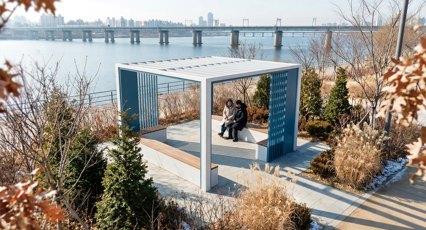 에어베이 플러스(AIR BAY PLUS)|DAUM-P-1159 제품목록으로 바로가기 자료 및 바로가기 나라장터 바로연결 도면 다운로드 시공사진 보러가기 기타 평면 지붕과 음각 라인 외벽을 적용한 사각 복합형 쉘터로, 화이트와 우드, 하늘색 조합이 밝고 정돈된 인상을 주는 개방형 휴식 공간이다. 제품명 에어베이 플러스(AIR BAY PLUS)|DAUM-P-1159 물품식별번호 25018070 규격 4,000 X 4,000 X 2,776(H) 재질 stl, galvanized, hard wood, polycarbonate, hpl 에어베이 플러스(AIR BAY PLUS)|DAUM-P-1159 물품식별번호 25018070 규격 4,000 X 4,000 X 2,776(H) 재질 stl, galvanized, hard wood, polycarbonate, hpl 기타 평면 지붕과 음각 라인 외벽을 적용한 사각 복합형 쉘터로, 화이트와 우드, 하늘색 조합이 밝고 정돈된 인상을 주는 개방형 휴식 공간이다. 자료 및 바로가기 나라장터 바로연결 도면 다운로드 시공사진 보러가기