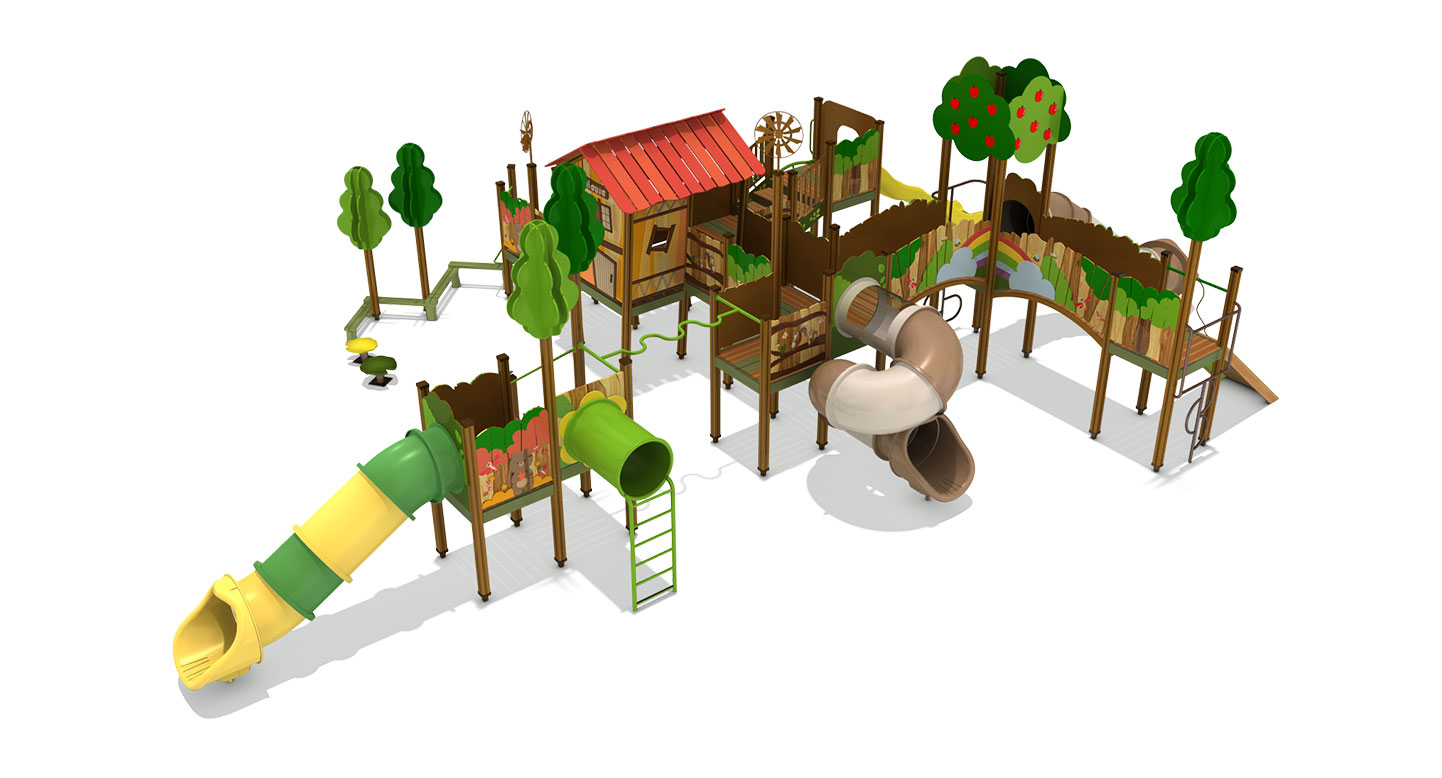 숲속마을의 랜드마크가 되는 대형 복합 놀이대입니다. 붉은 지붕의 에코 하우스와 풍성한 사과나무 타워가 구름다리로 연결되어 웅장함을 자랑합니다. 곳곳에 숨겨진 동물 친구들(토끼, 너구리) 그래픽과 다양한 슬라이드가 아이들에게 동화 속 주인공이 된듯한 환상적인 모험을 선사합니다.