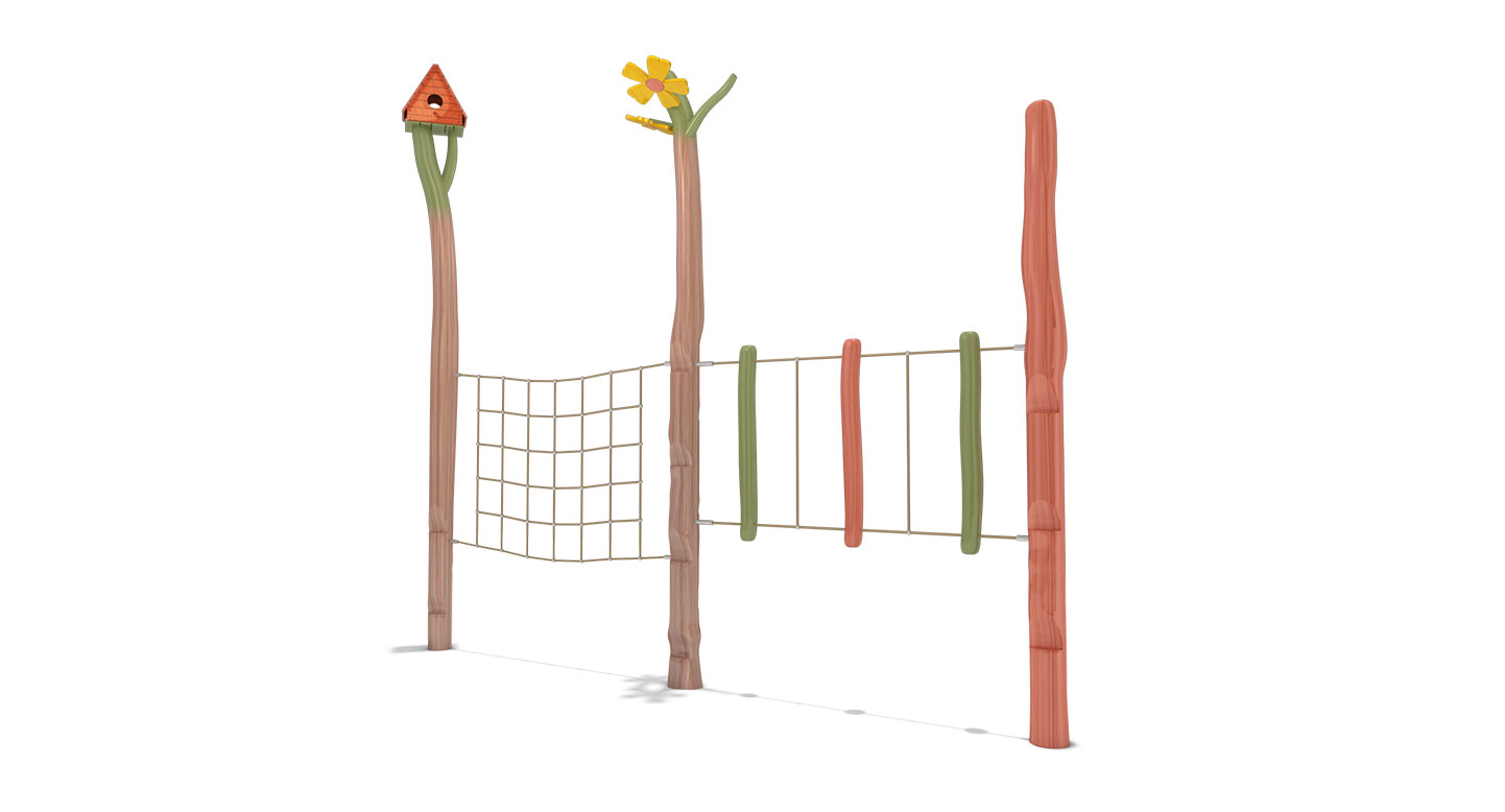 자연 수목을 형상화한 로비니아 목재 기둥과 로프 네트, 밸런스 브리지를 활용한 장애물 코스로, 아이들이 오르기‧건너기‧매달리기 등의 전신 활동을 통해 균형감각과 근력을 자연스럽게 발달시킬 수 있는 숲 테마 놀이시설입니다. 간결한 동선 구성으로 작은 공간에서도 높은 놀이 효과를 제공합니다.