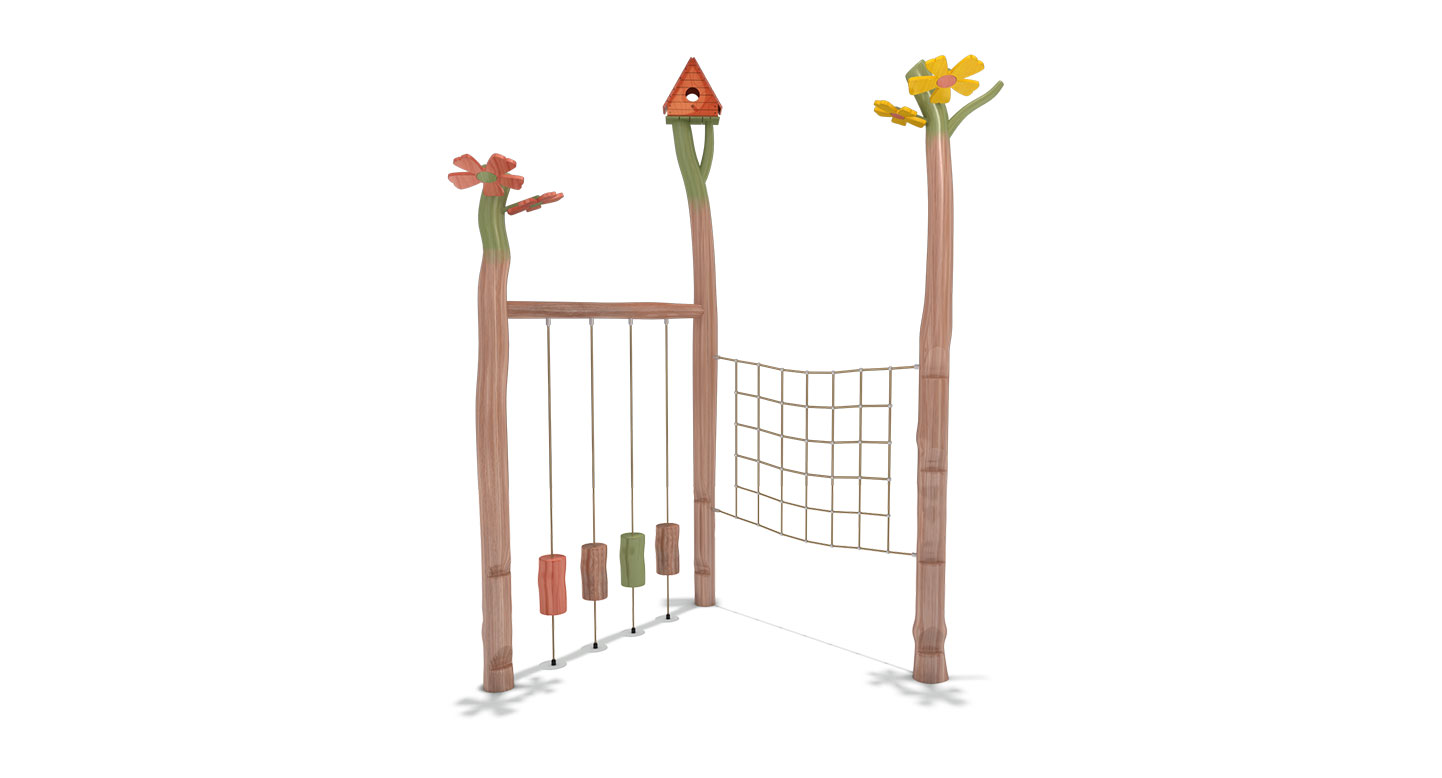 자연을 형상화한 로비니아 목재 구조에 로프와 네트 장애물을 결합하여, 아이들이 오르고 매달리고 균형을 잡는 다양한 동작을 통해 전신 근력과 협응력을 발달시킬 수 있는 활동형 놀이시설입니다. 꽃과 나뭇가지, 새집 등의 자연 요소를 더해 아이들이 숲속 모험을 즐기듯 놀이에 몰입할 수 있습니다.